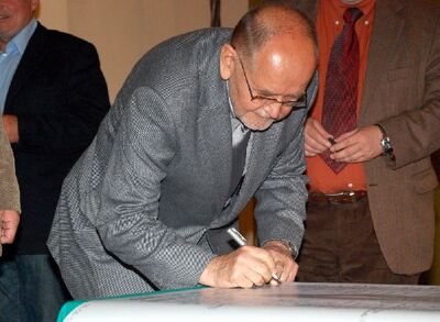 Goście przybyli na uroczystość podpisywali pamiątkowy plakat Solidarności. Na zdjęciu – dr Adolf Juzwenko -