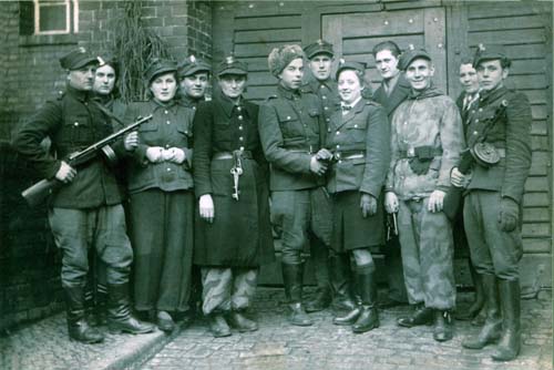 Kadra gdańskiego więzienia w roku 1945. Byli to ludzie z różnych zakątków Polski – tak różni jak ich ówczesne „umundurowanie". -