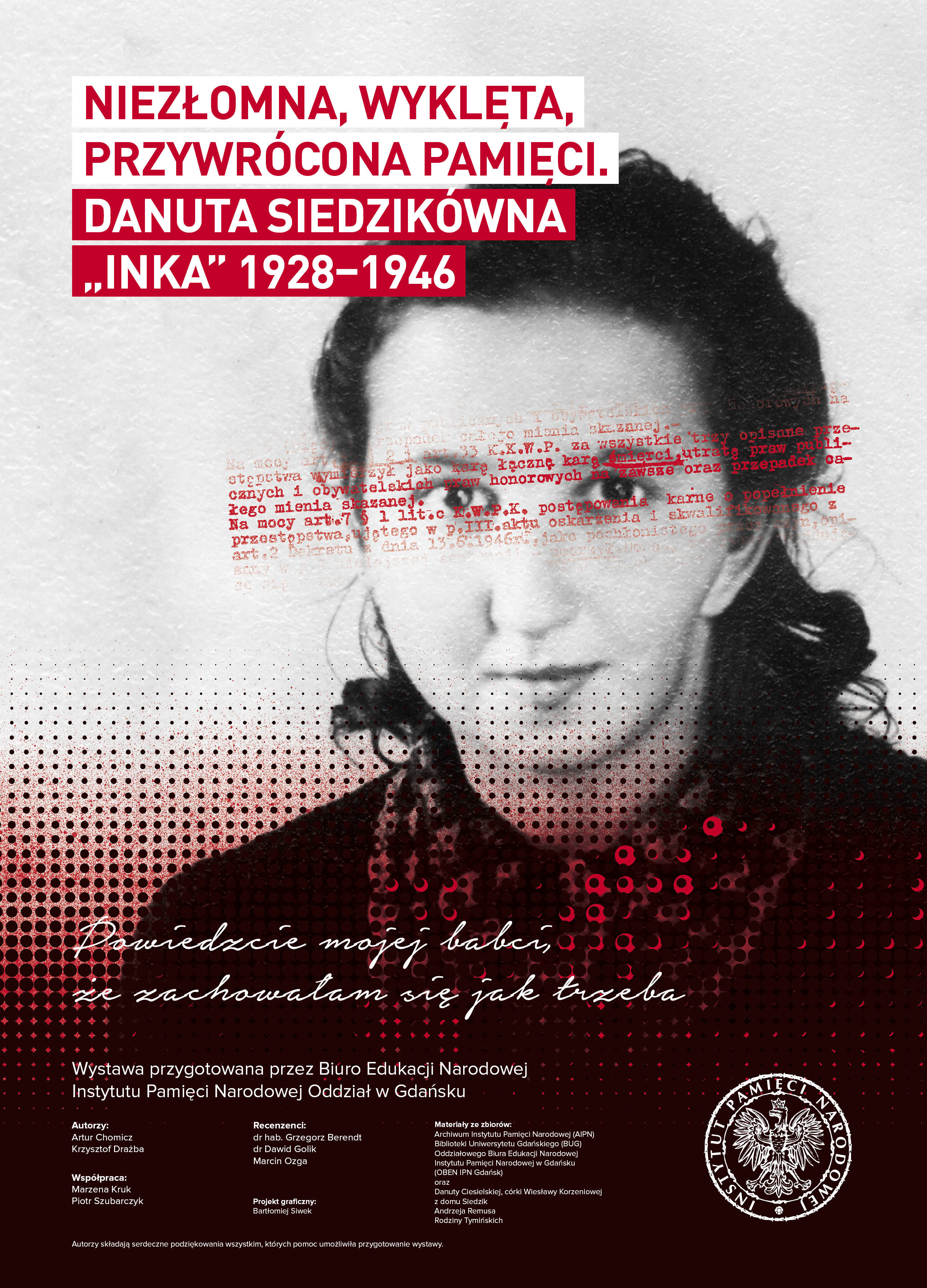 Instytut Pamięci Narodowej Oddział w Gdańsku zaprasza na wystawę „Niezłomna, wyklęta, przywrócona pamięci. Danuta Siedzikówna »Inka« 1928–1946”.