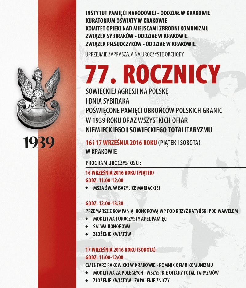Oddział Instytutu Pamięci Narodowej w Krakowie oraz Kuratorium Oświaty w Krakowie, Komitet Opieki nad Miejscami Komunizmu, Związek Sybiraków – Oddział w Krakowie i Związek Piłsudczyków – Oddział w Krakowie organizują w dniach 16-17 września br. uroczyste obchody 77. rocznicy sowieckiej agresji na Polskę i Dnia Sybiraka, poświęcone pamięci obrońców polskich granic w 1939 roku oraz wszystkich ofiar niemieckiego i sowieckiego totalitaryzmu.