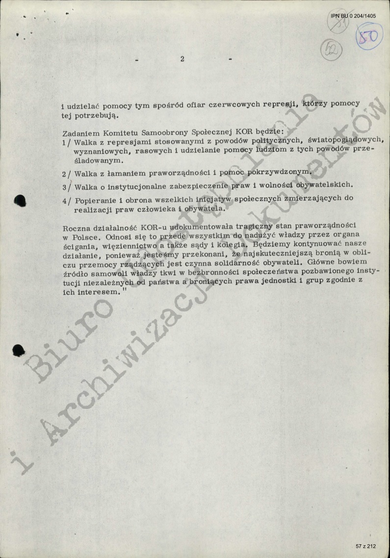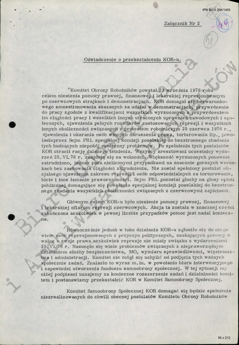 Dlatego niżej podpisani zawiązują Komitet Obrony Robotników w celu zainicjowania wszechstronnych form obrony i pomocy. Niezbędna jest pomoc prawna, finansowa i lekarska. Nie mniej istotna jest pełna informacja o prześladowaniach. Jesteśmy przekonani, że jedynie publiczne ujawnianie poczynań władzy może być skuteczną obroną. Dlatego m.in. prosimy wszystkich, którzy podlegali prześladowaniom lub wiedzą o nich, o przekazywanie członkom Komitetu wiadomości na ten temat(...). Komitet domaga się amnestii dla skazanych i aresztowanych i przywrócenia wszystkim represjonowanym pracy – solidaryzując się w tych żądaniach z uchwałą Konferencji Episkopatu z dnia 9 września. Komitet wzywa społeczeństwo do poparcia tych żądań.