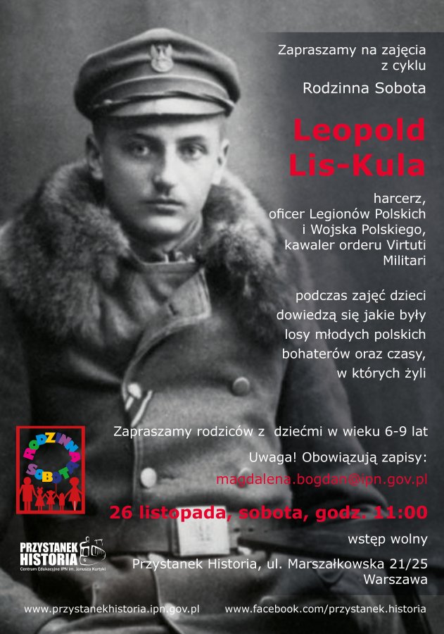 W sobotę 26 listopada, o godz. 11.00, Centrum Edukacyjne IPN Przystanek Historia zaprasza na zajęcia z cyklu „Rodzinna Sobota” dla dzieci w wieku 6–9 lat i rodziców. W tym roku szkolnym podczas „Rodzinnych Sobót” będziemy poznawać losy młodych polskich bohaterów oraz czasy, w których żyli. W listopadzie naszym przewodnikiem po historii walk o niepodległość Polski będzie Leopold Lis-Kula – harcerz, niezwykle utalentowany oficer Legionów Polskich i Wojska Polskiego, kawaler orderu Virtuti Militari.