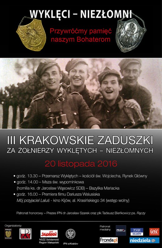 III Krakowskie Zaduszki za Żołnierzy Wyklętych – Niezłomnych rozpoczęły się przemarszem Wyklętych spod kościoła św. Wojciecha na Rynek Główny w Krakowie. W Bazylice Mariackiej została odprawiona msza św. wypominkowa. W uroczystościach wzięli udział prezes IPN dr Jarosław Szarek oraz wiceprezes IPN prof. Krzysztof Szwagrzyk.