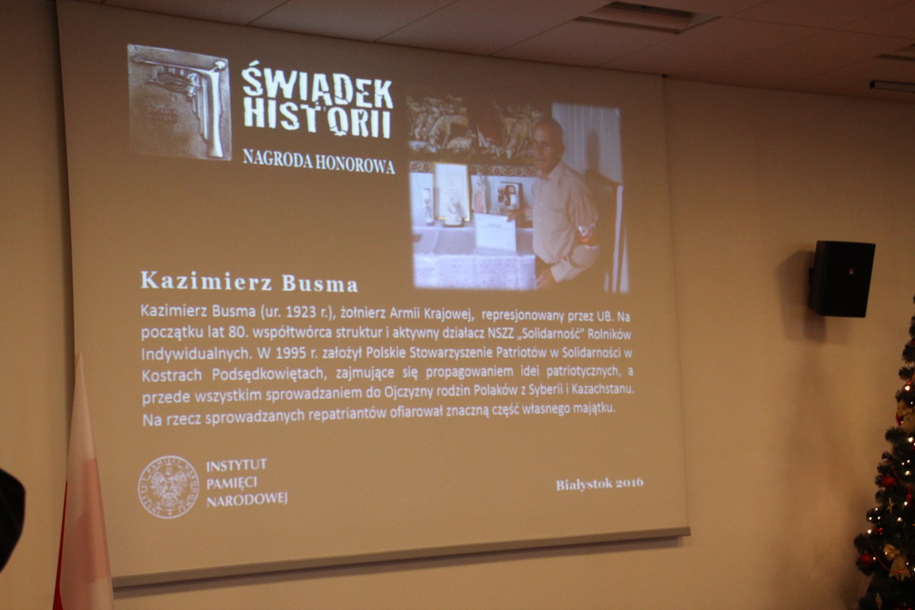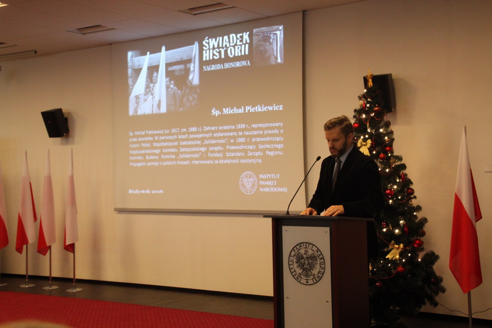W przedświątecznej atmosferze odbyło się uroczyste wręczenie Nagród Honorowych „Świadek Historii” w Oddziale IPN w Białymstoku. To już VIII edycja Nagrody. Od 2009 r. uhonorowano w ten sposób 73 osoby i instytucje, mające szczególne zasługi dla upamiętniania najnowszej historii Polski. W tegorocznej edycji Laureatami nagrody zostali: