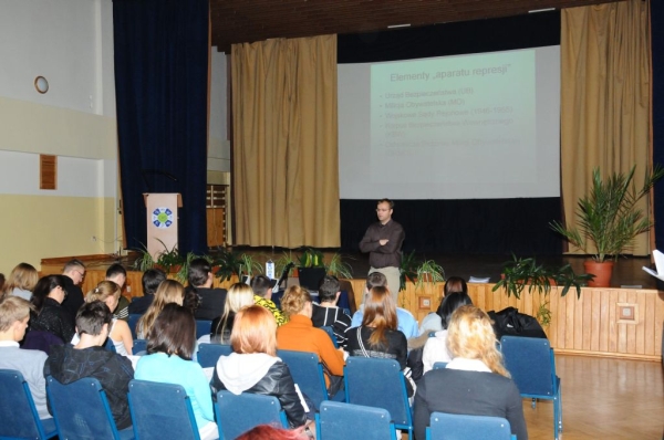 Paweł Miedziński przeprowadził wykład, podczas którego opowiedział historię aparatu bezpieczeństwa w Polsce Ludowej. Następnie uczniowie uczestniczyli w poszczególnych warsztatach, podczas których Katarzyna Rembacka prezentowała i komenatowała fragmenty filmów fabularnych ukazujących specyfikę pracy Urzędów Bezpieczeństwa i Służby Bezpieczeństwa. Podczas zajęć przeprowadzonych przez Marcina Ozgę uczniowie mogli poznać specyfikę pracy operacyjnej. Natomiast Grzegorz Czapski przeprowadził ćwiczenia z materiałami źródłowymi dotyczącymi Ruchu Wolność i Pokój.