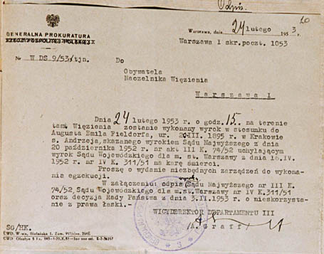 fot. 1. Polecenie wykonania wyroku śmierci na generale Emilu Fieldorfie "Nilu".