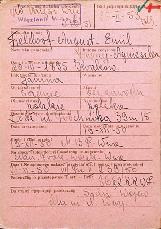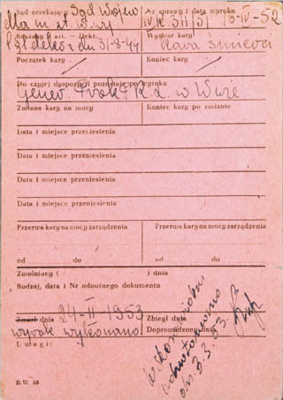 fot. 3, 4. Karta z kartoteki skazanych w latach 1945-56. W prawym górnym rogu krzyżyk naniesiony czerwoną kredką oznacza wyrok śmierci (awers i rewers).