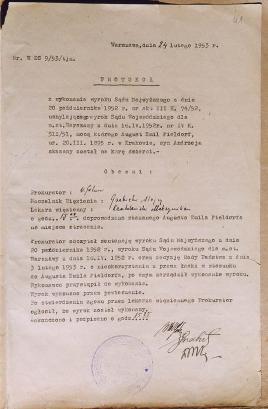 fot. 5. Protokół wykonania kary śmierci na generale Emilu Fieldorfie.
