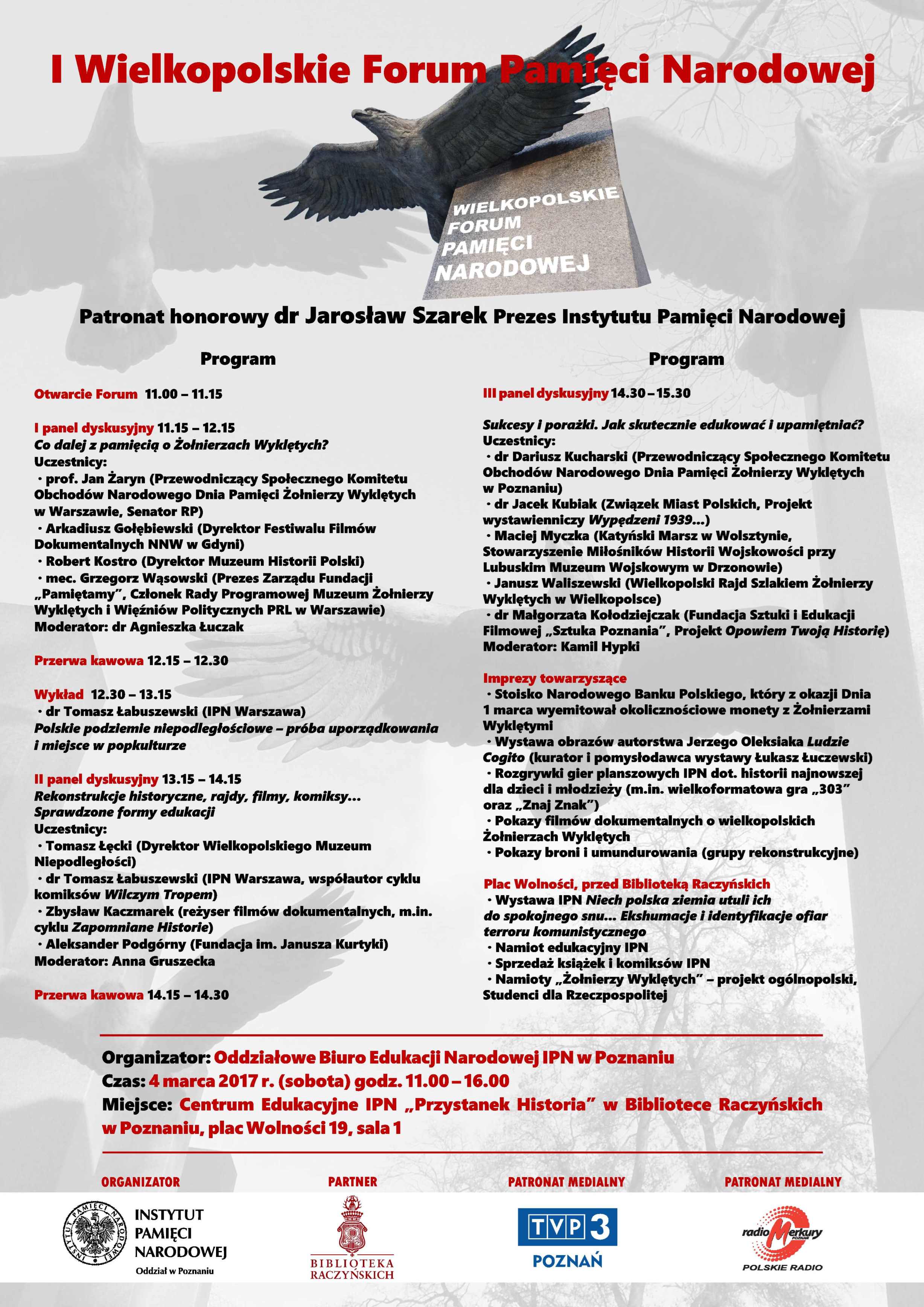 4 marca br. w Bibliotece Raczyńskich („Przystanek Historia”) odbyło się I Wielkopolskie Forum Pamięci Narodowej, zorganizowane przez Oddziałowe Biuro Edukacji Narodowej IPN w Poznaniu. Tegoroczne Forum stanowiło podsumowanie poznańskich obchodów Narodowego Dnia Pamięci Żołnierzy Wyklętych i w całości poświęcone było żołnierzom drugiej konspiracji. Było również zaproszeniem do współpracy dla lokalnych środowisk, zajmujących się tą tematyką w Wielkopolsce.