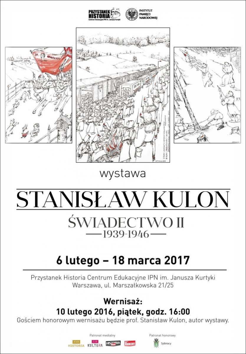 W dniach 6 lutego – 18 marca Przystanek Historia – Centrum Edukacyjne IPN im. Janusza Kurtyki, przy ul. Marszałkowskiej 21/25 w Warszawie, zaprasza na nową wystawę prac Stanisława Kulona „Świadectwo II. 1939–1946”. To już trzecia prezentacja twórczości wybitnego rzeźbiarza i pedagoga, ukazująca tragiczne losy Polaków deportowanych do ZSRR. Na ekspozycję składają się rysunki czarnym i kolorowym tuszem inspirowane pierwszą wersją cyklu „Droga Krzyżowa”, prace z okresu studiów na warszawskiej ASP oraz drewniane rzeźby i reliefy – zapowiedź kolejnego cyklu, nad którym obecnie pracuje profesor Kulon. Uroczysty wernisaż z udziałem Autora odbył się 10 lutego, w 77. rocznicę pierwszej wywózki obywateli polskich do ZSRR.