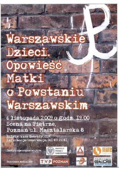 W dniu 6 listopada br. o godz. 19.00 w poznańskiej Scenie na Piętrze przy ul. Masztalarskiej 8 został wystawiony spektakl pt. „Warszawskie Dzieci. Opowieść Matki o Powstaniu Warszawskim”. Spektakl zainaugurował poznańskie obchody w ramach ogólnopolskiego projektu edukacyjnego Instytutu Pamięci Narodowej – Rok Kultury Niezależnej.