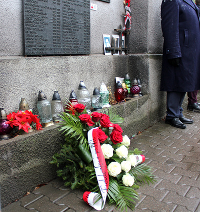 Uczestnicy uroczystości złożyli wieniec pod tablicą upamiętniającą miejsce kaźni polskich patriotów.