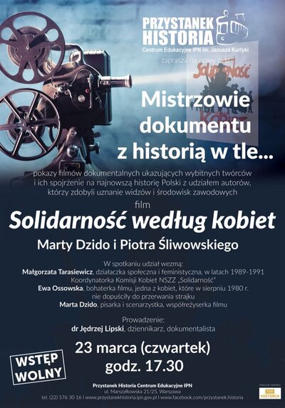 W ramach cyklu „Mistrzowie dokumentu z historią w tle” zapraszamy na pokaz filmu Marty Dzido i Piotra Śliwowskiego „Solidarność według kobiet”. W spotkaniu towarzyszącym filmowi udział wezmą Małgorzata Tarasiewicz, działaczka społeczna i feministyczna, w latach 1989–1991 koordynatorka Komisji Kobiet NSZZ „Solidarność”; Ewa Ossowska, bohaterka filmu, jedna z kobiet, które w sierpniu 1980 r. nie dopuściły do przerwania strajku, oraz Marta Dzido, pisarka i scenarzystka, współreżyserka filmu. Prowadzenie: Jędrzej Lipski, historyk i dokumentalista.