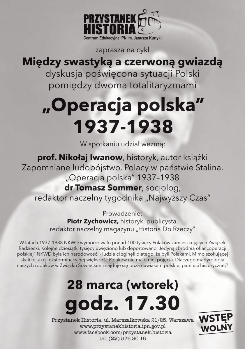 W trakcie „operacji polskiej” NKWD wymordowało ponad 100 tysięcy Polaków zamieszkujących Związek Radziecki. Kolejne dziesiątki tysięcy uwięziono lub deportowano. Jedyną „zbrodnią” ofiar była ich narodowość. – ludzie ci zginęli dlatego, że byli Polakami. Mimo szokującej skali tej akcji eksterminacyjnej większość Polaków nie ma o niej pojęcia. Dlaczego martyrologia naszych rodaków w Związku Sowieckim znajduje się poza nawiasem polskiej pamięci historycznej? Będą o tym dyskutować prof. Nikołaj Iwanow, historyk, autor książki Zapomniane ludobójstwo. Polacy w państwie Stalina. „Operacja polska” 1937–1938 i dr Tomasz Sommer, socjolog, redaktor naczelny tygodnika „Najwyższy Czas”. Prowadzenie: Piotr Zychowicz, redaktor naczelny magazynu „Historia Do Rzeczy”.