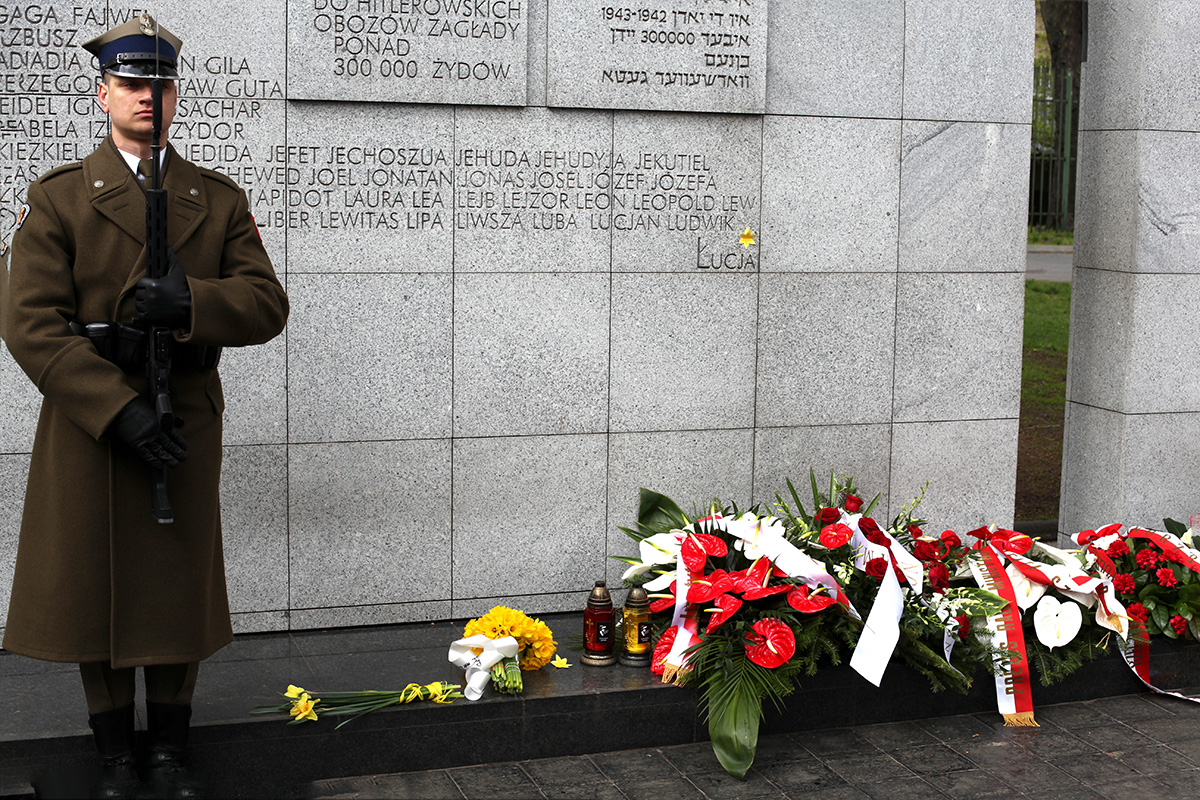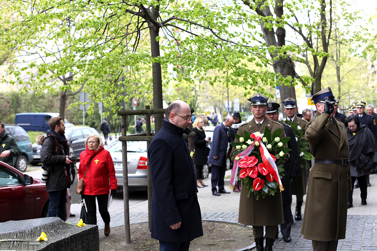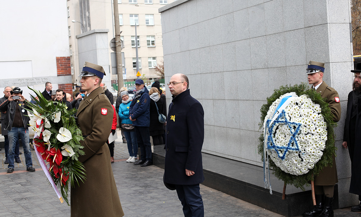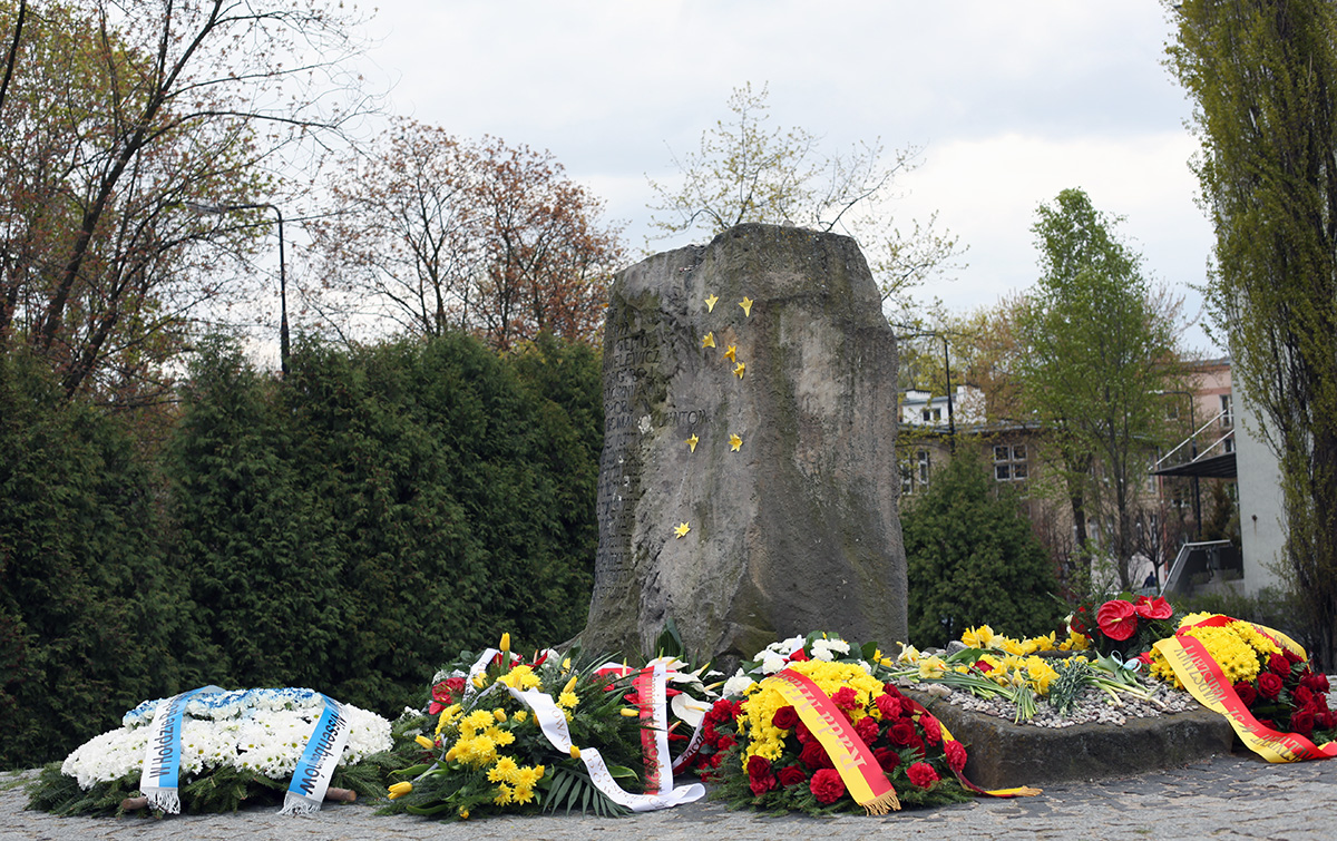Wiceprezes IPN dr Mateusz Szpytma, wraz z innymi delegacjami, złożył też wieńce przed pomnikiem Szmula Zygielbojma, przy Bunkrze Anielewicza i na Umschlagplatz.