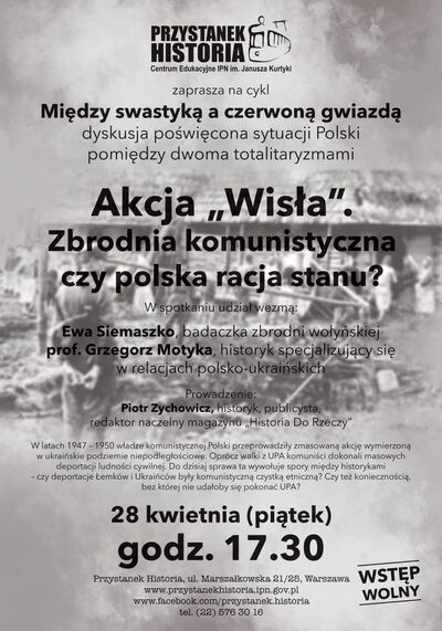 28 kwietnia 2017 (piątek), o godz. 17.30, Centrum Edukacyjne IPN im. Janusza Kurtyki „Przystanek Historia” zaprasza na spotkanie z cyklu „Między swastyką a czerwoną gwiazdą”, poświęcone akcji „Wisła”. Gośćmi Piotra Zychowicza będą: Ewa Siemaszko, badaczka zbrodni wołyńskiej, oraz prof. Grzegorz Motyka, historyk specjalizujący się w relacjach polsko-ukraińskich.
