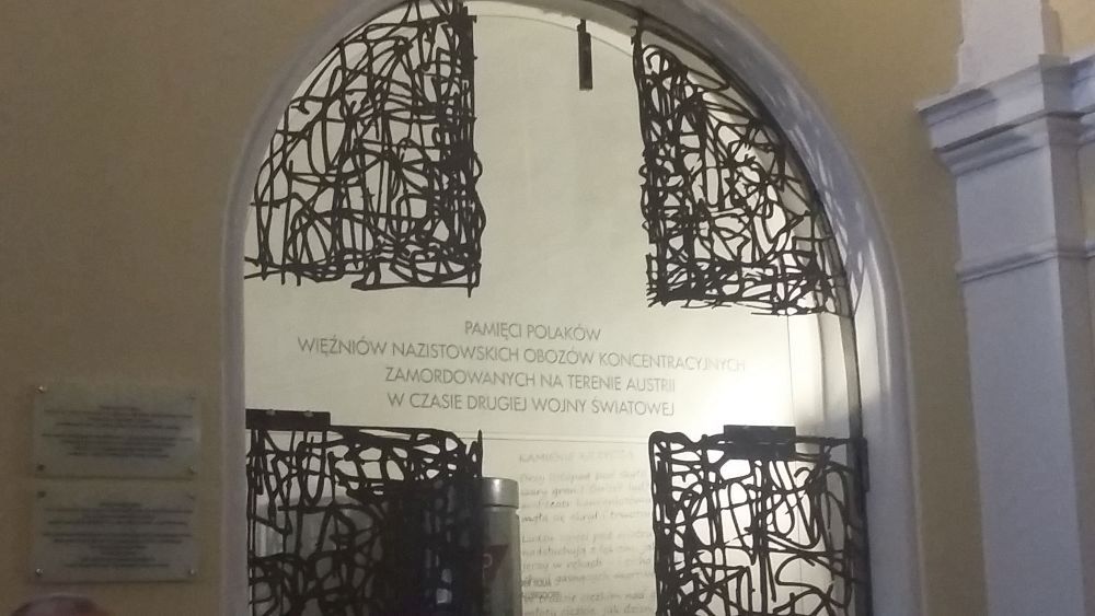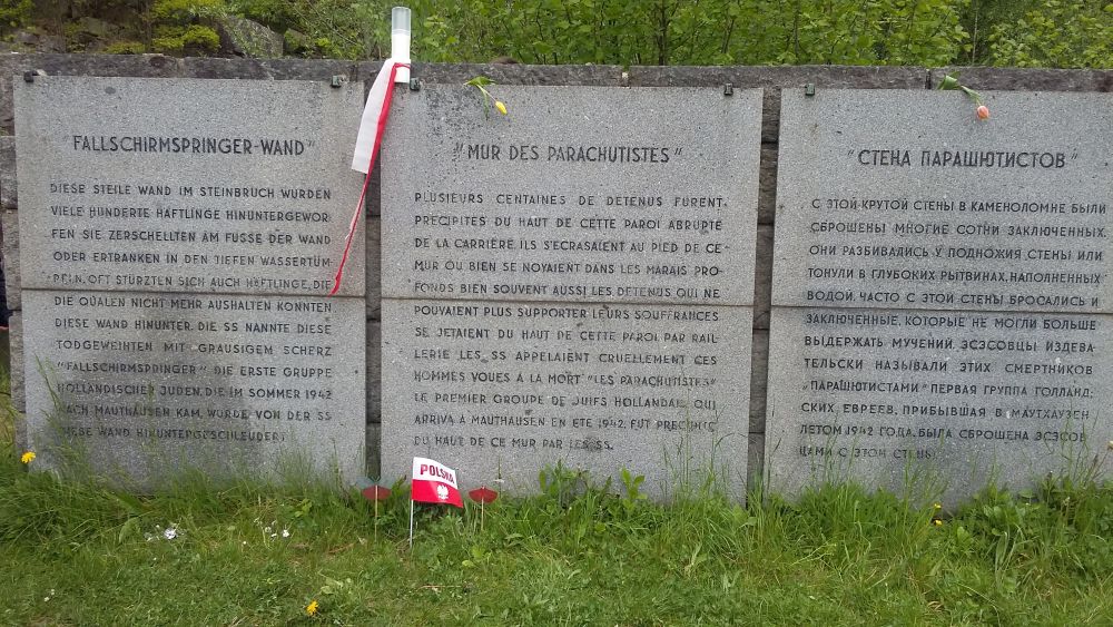 Zwiedzanie Mauthausen – tablica upamiętniająca „spadochroniarzy” -