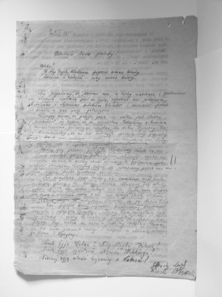 Nie zamilkną nasze hasła. Nie zaginie myśl walki za świętą sprawę, na której ostrzu składamy swe młode życia. Sprawa dla dobra całego narodu była nam droższa od życia i chociaż wielu z nas nie dożyje chwili wolności, to jednak chwila ta nadejdzie, doczeka się jej Naród Polski. Dziś poprzez kraty więzienne, pozdrawiamy naszych braci i cierpiącą Ojczyznę i przesyłamy wam wszystkim wyrazy otuchy i wiary w świetlaną przyszłość. Niechaj nie płyną łzy Matek za nami. Jesteśmy szczęśliwi i dumni, że los nam pozwolił walczyć i cierpieć w obronie własnego Domu i Ojczyzny.
