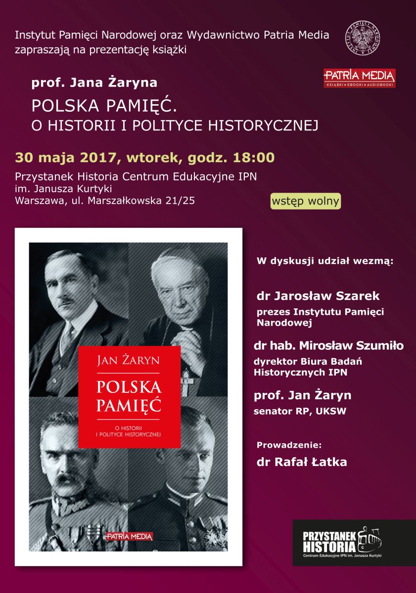 – Musimy przekroczyć straszne dziedzictwo brzydkiego, odpychającego PRL. (...) Musimy się wybić na duchową niepodległość, skończyć z kolonialnym spojrzeniem na nasze dzieje. Jesteśmy wielkim, dumnym narodem. Musimy pozbyć się kompleksów – podkreślił prezes IPN dr Jarosław Szarek, który wziął udział w dyskusji zorganizowanej 30 maja 2017 na warszawskim Przystanku Historia w związku z premierą książki prof. Jana Żaryna Polska pamięć. O historii i polityce historycznej.