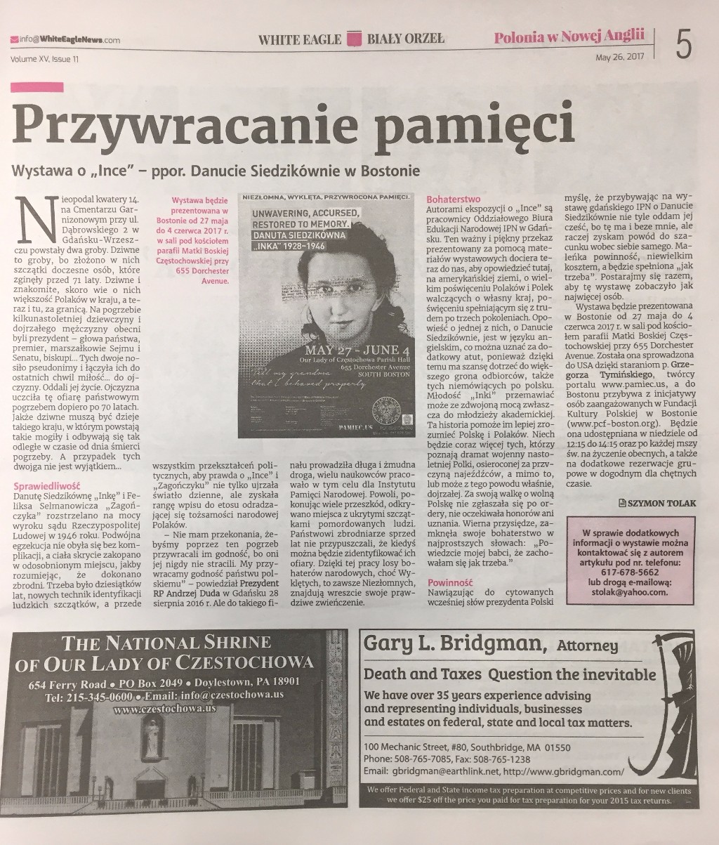 Dzięki staraniom Grzegorza Tymińskiego, twórcy portalu pamiec.us, a także członkom Fundacji Kultury Polskiej w Bostonie, gdańska wystawa IPN o Danucie Siedzikównie „Ince” dotarła na wschodnie wybrzeże Stanów Zjednoczonych. Jak zapewniają nas twórcy wystawy, będzie ona dostępna w sali pod kościołem pw. Matki Boskiej Częstochowskiej przy 655 Dorchester Avenue od 27 maja do 4 czerwca br. Można ją będzie zwiedzać w niedzielę 28 maja i 4 czerwca oraz w pozostałych dniach po wcześniejszej rezerwacji.