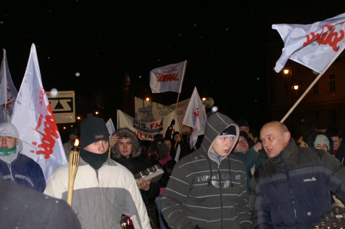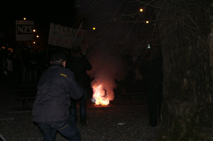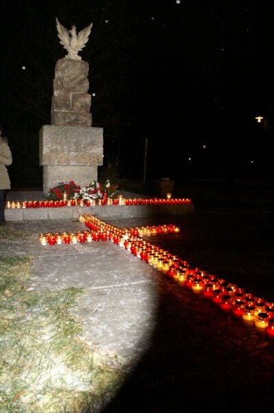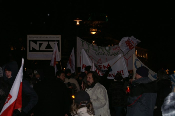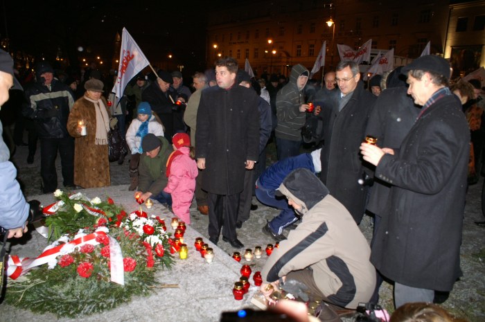 - 17.20 – Ułożenie krzyża ze zniczy przed pomnikiem Konstytucji 3 maja; zakazane piosenki; „nielegalny” druk kalendarza na rok 2010; informacja o 13 grudnia 1981 r. i ulotki przygotowane przez IPN