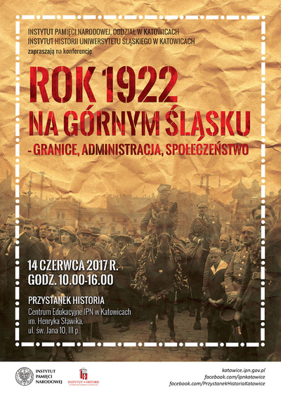 14 czerwca 2017 r., o godz. 10.00, w Przystanku Historia – Centrum Edukacyjnym IPN w Katowicach im. Henryka Sławika, przy ul. św. Jana 10 (III piętro) odbyła się konferencja naukowa „Rok 1922 na Górnym Śląsku – granice, administracja, społeczeństwo”.