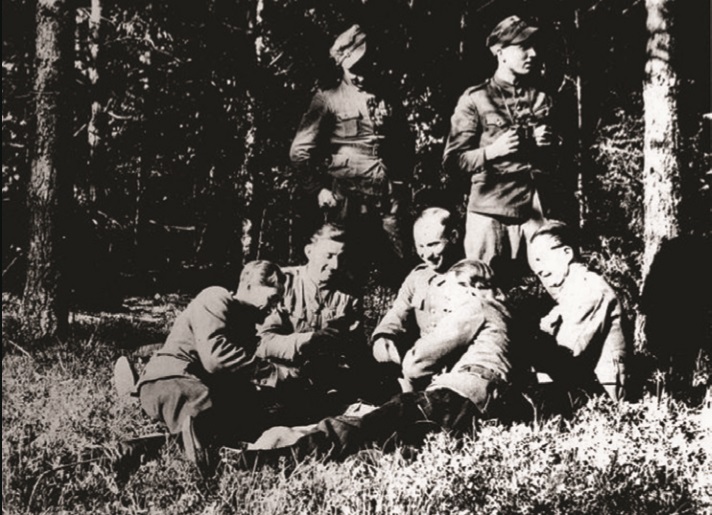Siedzi pośrodku mjr Franciszek Szabunia „Zemsta”, „Lechita”, inspektor Inspektoratu Suwalskiego AKO, 1945 r. (zbiory IPN) -