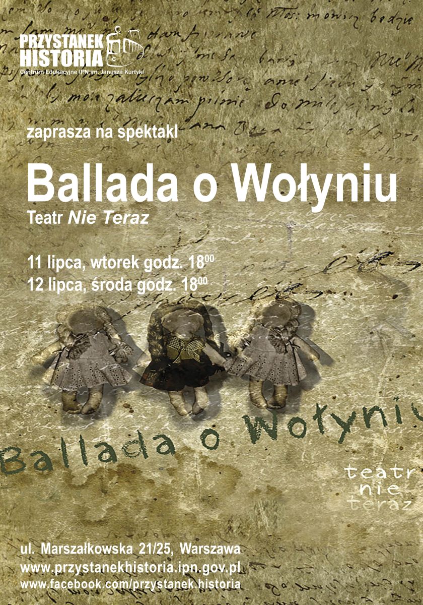 „Ballada o Wołyniu” to pierwszy w Polsce spektakl sceniczny, który opowiada o ludobójstwie na polskiej ludności Kresów Wschodnich w latach II wojny światowej, dokonanym przez nacjonalistów ukraińskich. Scenariusz spektaklu korzysta z wątków legendarnej książki Włodzimierza Odojewskiego „Zasypie wszystko, zawieje”. Wykorzystane zostały także świadectwa osób, które przeżyły zagładę Polaków na Kresach oraz stare pieśni, w tym melodia ukraińska ze współczesnymi słowami Bogny Lewtak-Baczyńskiej.