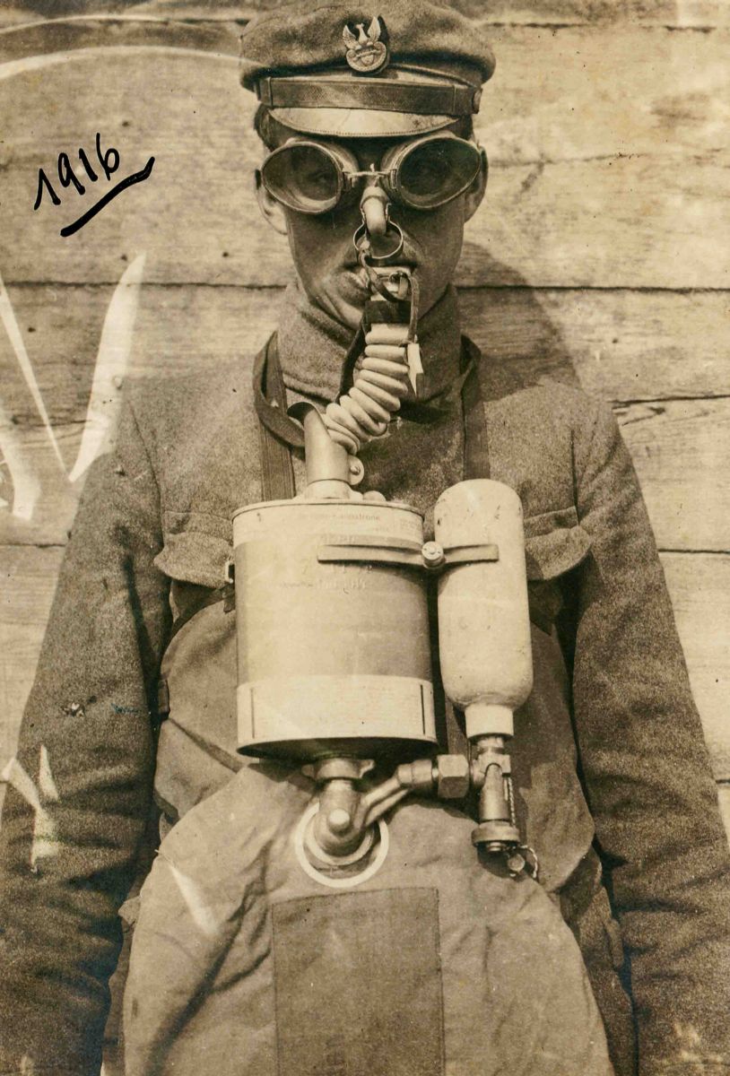 Żołnierz I Brygady Legionów w masce przeciwgazowej (zbiory Instytutu Józefa Piłsudskiego w Londynie) -
