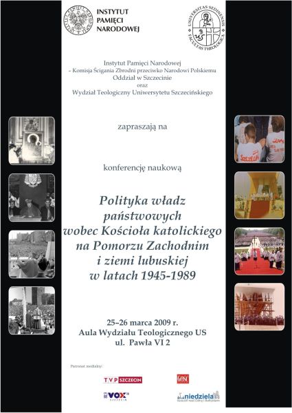 Konferencja naukowa „Polityka władz państwowych wobec Kościoła katolickiego na Pomorzu Zachodnim i ziemi lubuskiej w latach 1945–1989” zorganizowana została przez Instytutu Pamięci Narodowej – Komisję Ścigania Zbrodni przeciwko Narodowi Polskiemu Oddział w Szczecinie i Katedrę Historii Kościoła Wydziału Teologicznego Uniwersytetu Szczecińskiego. Odbyła się w auli Wydziału Teologicznego Uniwersytetu Szczecińskiego 25–26 marca 2009 r. Jej celem było przybliżenie historii walki „o rząd dusz”, jakie toczyły komunistyczne władze z Kościołem katolickim w okresie PRL-u. Staraliśmy się przybliżyć specyfikę działalności duchowieństwa na Pomorzu Zachodnim i Ziemi Lubuskiej oraz struktury i metody aparatu represji, którego zadaniem była ateizacja społeczeństwa. Częścią integralną konferencji był panel dyskusyjny, w którym wzięli udział historycy oraz uczestnicy wydarzeń, a który miał za cel pokazanie wielu postaw, zarówno duchownych, jak i społeczeństwa, wobec polityki władz państwowych wymierzonej w Kościół katolicki w tym okresie.