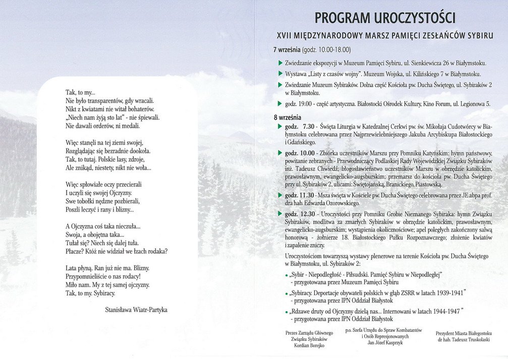 Tysiące uczestników z całego kraju, kilkuset gości ze świata i ponad 250 pocztów sztandarowych uczestniczyło 8 września 2017 r. w Białymstoku w Międzynarodowym Marszu Zesłańców Sybiru, który zorganizował po raz siedemnasty Związek Sybiraków. Nie zabrakło też przedstawiciela Prezedenta RP ministra Andrzeja Dery, urzędników Kancelarii Pani Premier, obecni byli także p.o. Szefa Urzędu ds. Kombatantów Jan Józef Kasprzyk oraz minister w kancelarii Prezesa RM Anna Anders, wojewoda podlaski Bohdan Paszkowski, przedstawiciele duchowieństwa, służb mundurowych, młodzież, uczniowie. Prezesa Instytutu Pamięci Narodowej reprezentował wiceprezes Jan Baster oraz liczne grono pracowników Oddziału IPN w Białymstoku z dyrektorem dr. hab. Piotrem Kardelą na czele. Uczestnicy marszu przeszli z Placu Katyńskiego do kościoła Ducha Świętego, gdzie arcybiskup senior Edward Ozorowski odprawił mszę świętą w intencji Sybiraków. Po nabożeństwie, przed Grobem Nieznanego Sybiraka odczytano listy od Prezydenta RP Andrzeja Dudy oraz Premier Beaty Szydło. W liście Prezydenta RP znalazło się m.in. następujące stwierdzenie: „Nam, żyjącym w Polsce na powrót suwerennej, realia tamtych lat zniewolenia wręcz trudno sobie wyobrazić. Ale jestem przekonany, że pielęgnowanie pamięci o Golgocie Wschodu jest naszym obowiązkiem, wynikającym z troski o tożsamość i dziedzictwo, a jednocześnie o dziś, i jutro naszego narodu”. Premier Beata Szydło napisała w swoim liście m.in., że „Sybir pozostawił głęboką bliznę w zbiorowej świadomości Polaków, stał się symbolem wyniszczenia naszego narodu, ale także nierównej walki zesłańców o zachowanie polskości”.