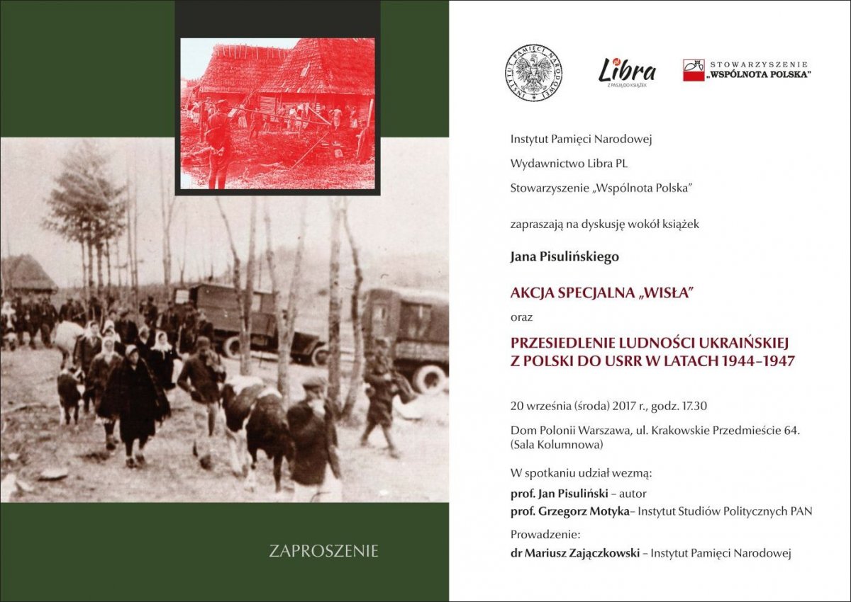 Instytut Pamięci Narodowej, Wydawnictwo Libra PL oraz Stowarzyszenie „Wspólnota Polska” zapraszają na dyskusję wokół książek Jana Pisulińskiego Aakcja specjalna „Wisła” i Przesiedlenie ludności ukraińskiej z polski do USRR w latach 1944–1947.