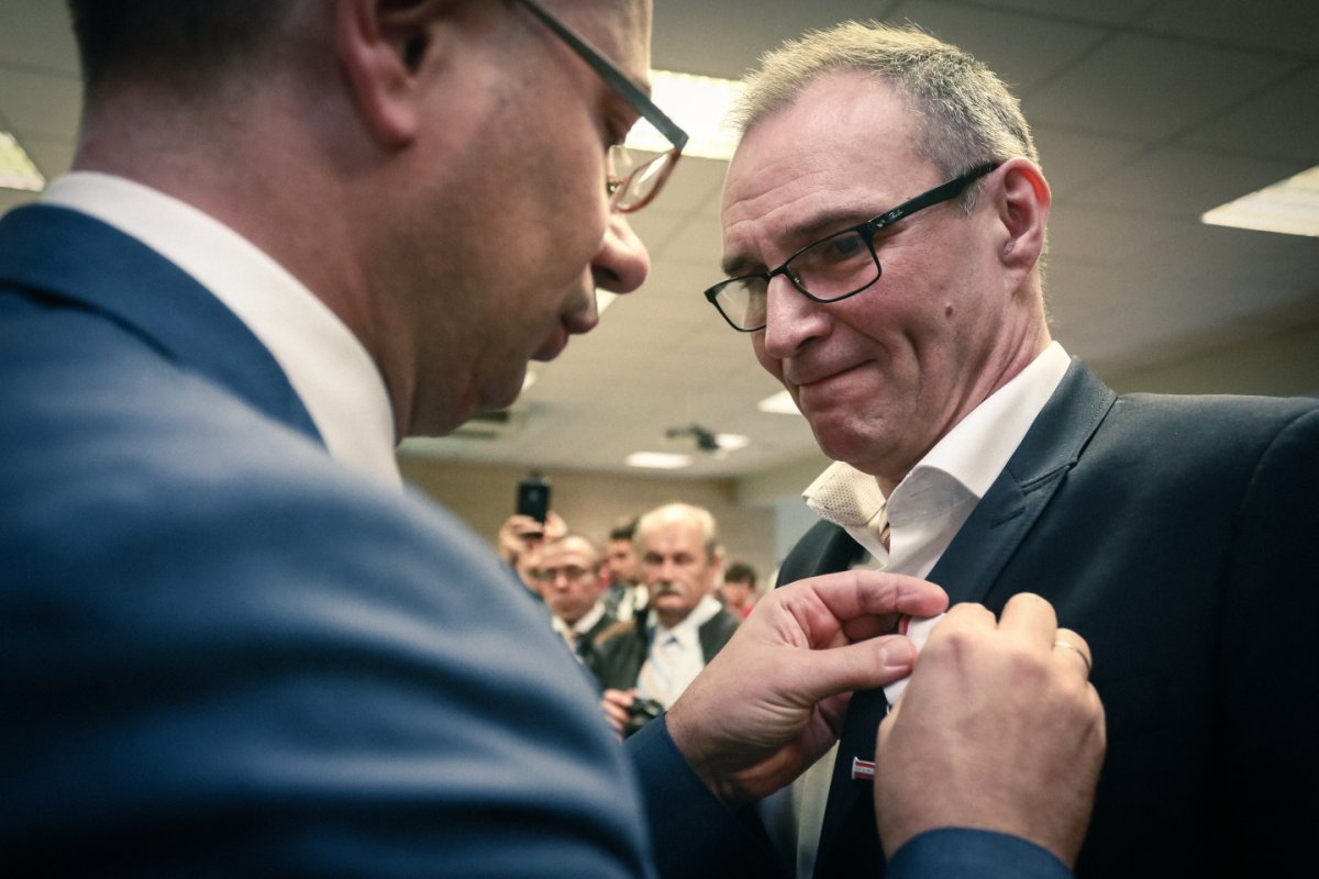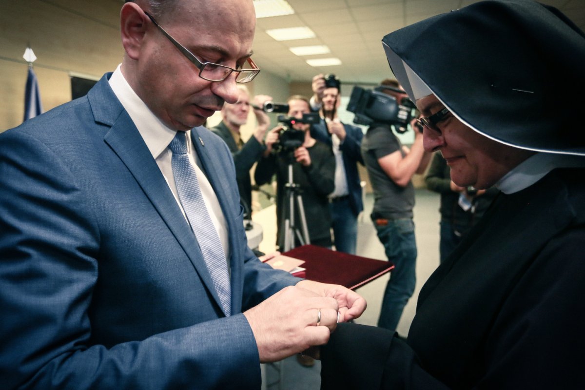 W imieniu Prezydenta Rzeczypospolitej Polskiej Andrzeja Dudy uroczystej dekoracji dokonał wiceprezes Instytutu Pamięci Narodowej dr Mateusz Szpytma. W swoim wystąpieniu podczas uroczystości wiceprezes Szpytma podkreślił, że państwo polskie nadrabia wieloletnie zaległości wobec osób, które walczyły o niepodległość nie tylko wręczając Krzyże Wolności i Solidarności, ale także podwyższając im emerytury. Stwierdził m.in.: „Poprzez to odznaczenie pokazujemy Polsce osoby, które szczególnie przyczyniły się do uzyskania prawdziwej niepodległości w 1989 roku. Bez tych wszystkich ludzi nie moglibyśmy się nią cieszyć”. Podkreślił też wkład Federacji Młodzieży Walczącej, której dwunastu najaktywniejszych działaczy zostało wczoraj odznaczonych: „Rzadko się zdarza, żeby tak dużej grupie osób przydzielano odznaczenia. Należy jednak zauważyć, że Federacja była tutaj szczególnie mocna. Cieszę się, że jest taka możliwość, żeby to środowisko w należyty sposób zostało docenione”. Wiceprezes Szpytma poprosił także odznaczonych, by podziękowali w jego imieniu swoim bliskim, którzy również uczestniczyli w zmaganiach z systemem komunistycznym. Podziękowanie w imieniu odznaczonych wygłosił Jarosław Żukowski, były działacz opozycyji z Kętrzyna, który stwierdził: „Dziękuję za to, że możemy dzisiaj poczuć się dumni z tego, że w tamtych dziwnych, złych czasach byliśmy po właściwej stronie, po stronie dobra i prawdy. Nikt z nas nie czuje się bohaterem, po prostu robiliśmy to, co wtedy trzeba było robić”. Uroczystość uświetnił występ Nelly Chojnowskiej-Ochnio, która wykonała piosenki: „Mury”, „Taki kraj” i „Ojczyzno ma”.