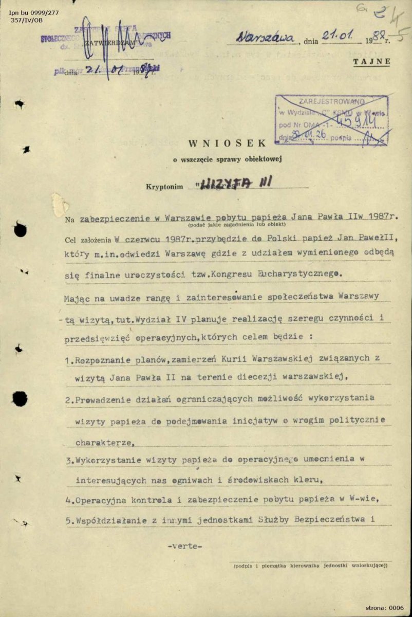 Wniosek o wszczęcie sprawy obiektowej krypt. „Wizyta III” dot. zabezpieczenia pobytu Papieża w Warszawie w 1987 r., IPN BU 0999_277, s.10-11 -