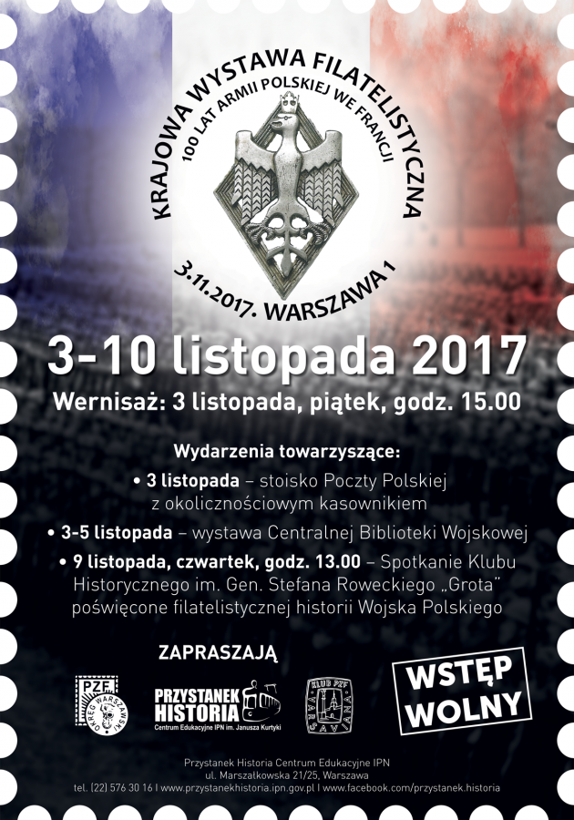 Od piątku 3 listopada w Centrum Edukacyjnym IPN im. Janusza Kurtyki „Przystanek Historia” czynna jest Krajowa Wystawa Filatelistyczna „100 lat Armii Polskiej we Francji”. Wystawę można oglądać do 10 listopada 2017.