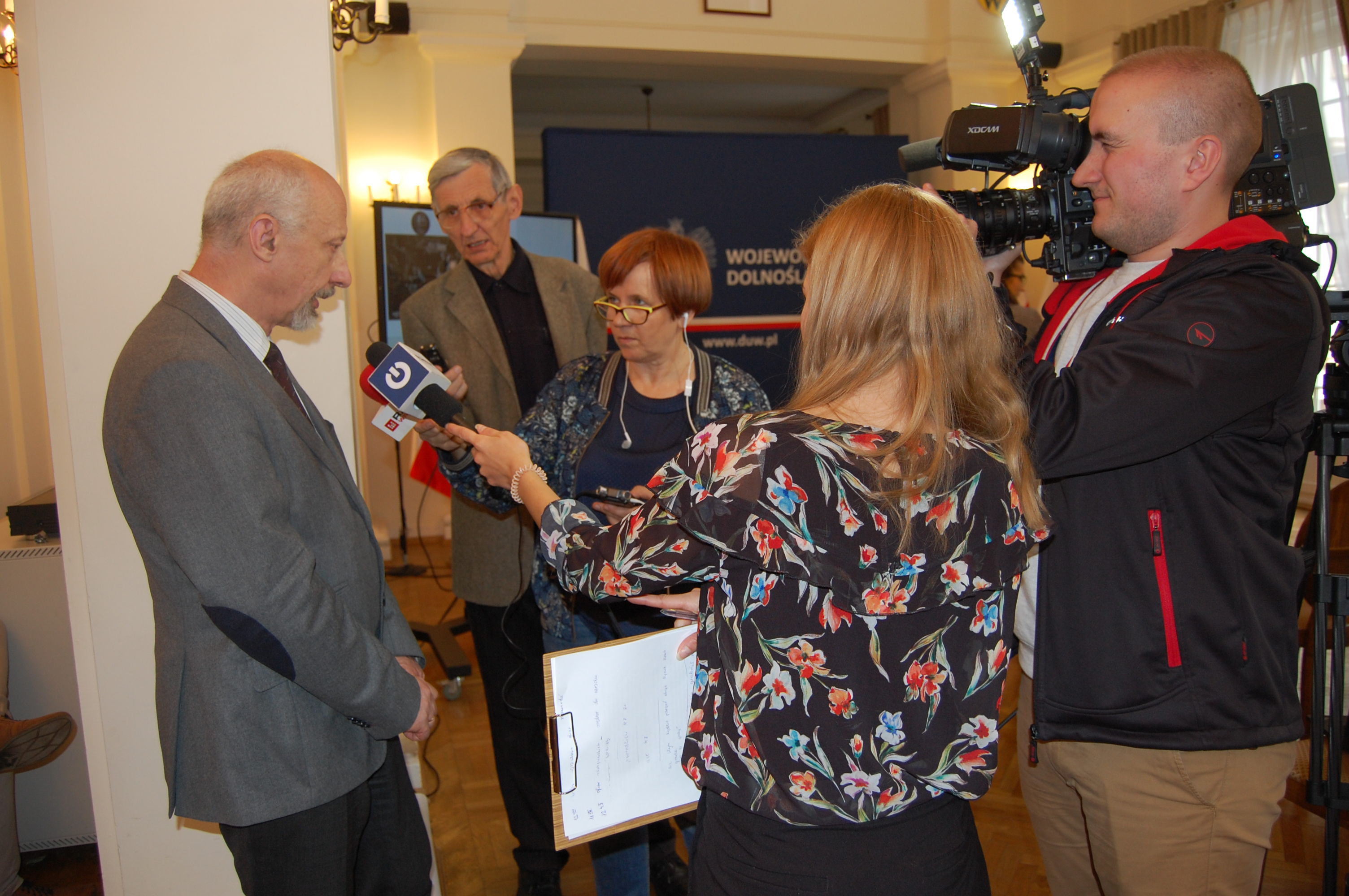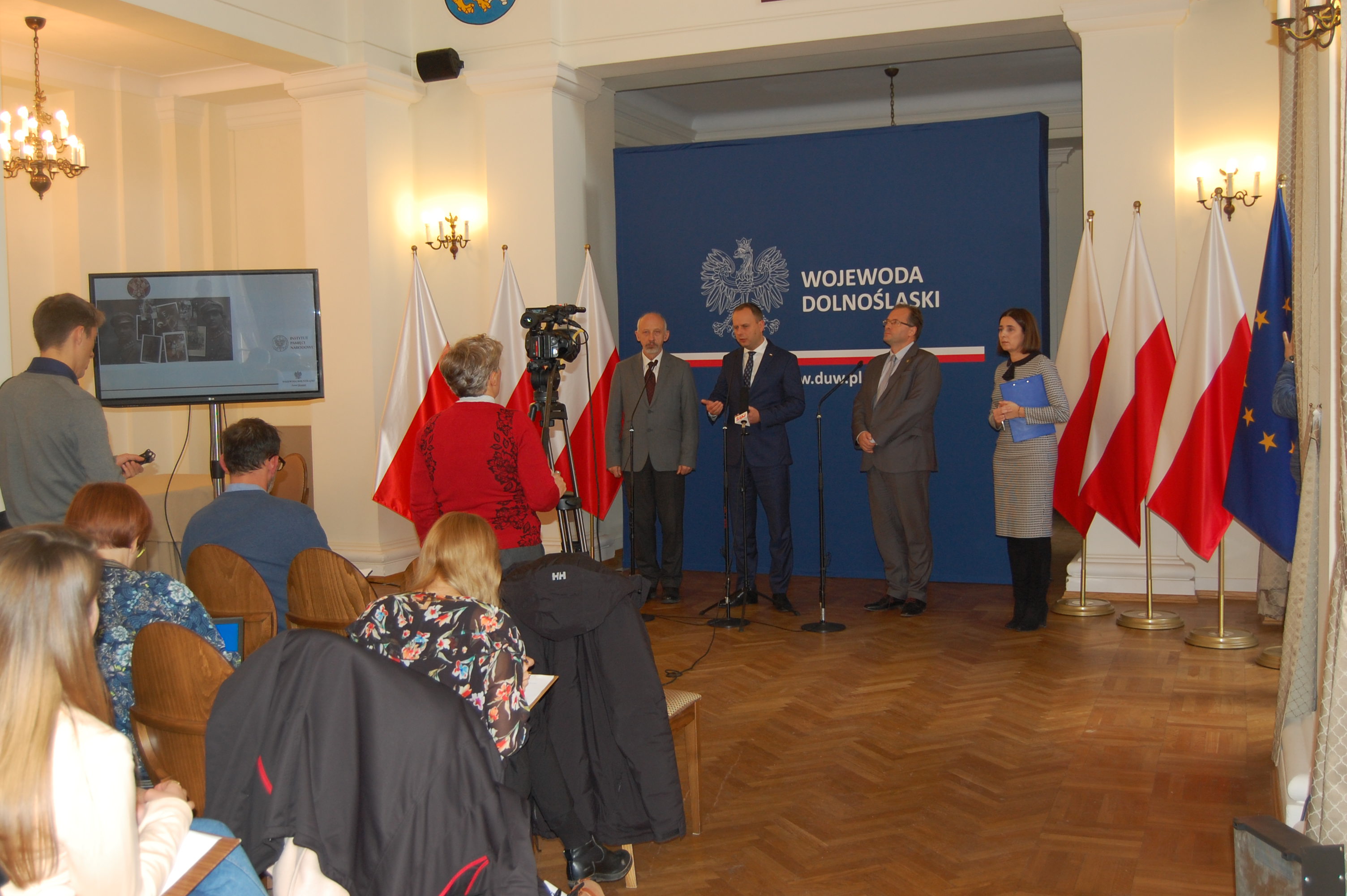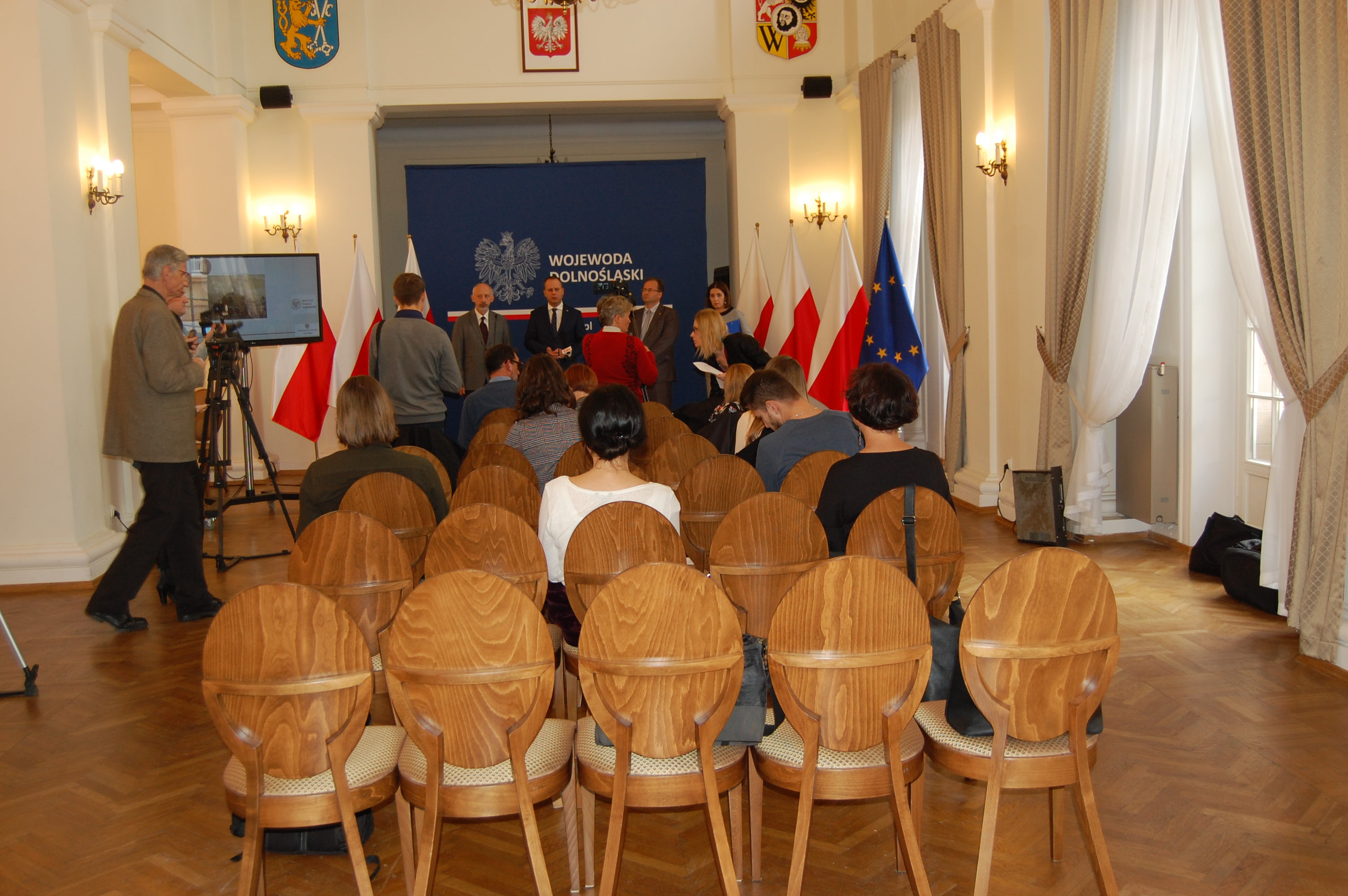 Konferencja prasowa w Sali Kolumnowej Dolnośląskiego Urzędu Wojewódzkiego we Wrocławiu -