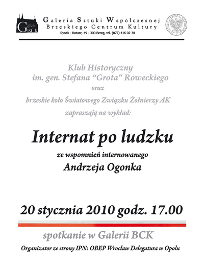 20 stycznia 2010 r. odbyło się spotkanie Klubu Historycznego im. gen. Stefana Roweckiego „Grota” w Brzegu. Uczestnicy spotkania mieli możliwośc wysłuchania prelekcji „Internat po ludzku – relacja internowanego w Grodkowie, w stanie wojennym działacza Solidarności z Brzegu Andrzeja Ogonka”.