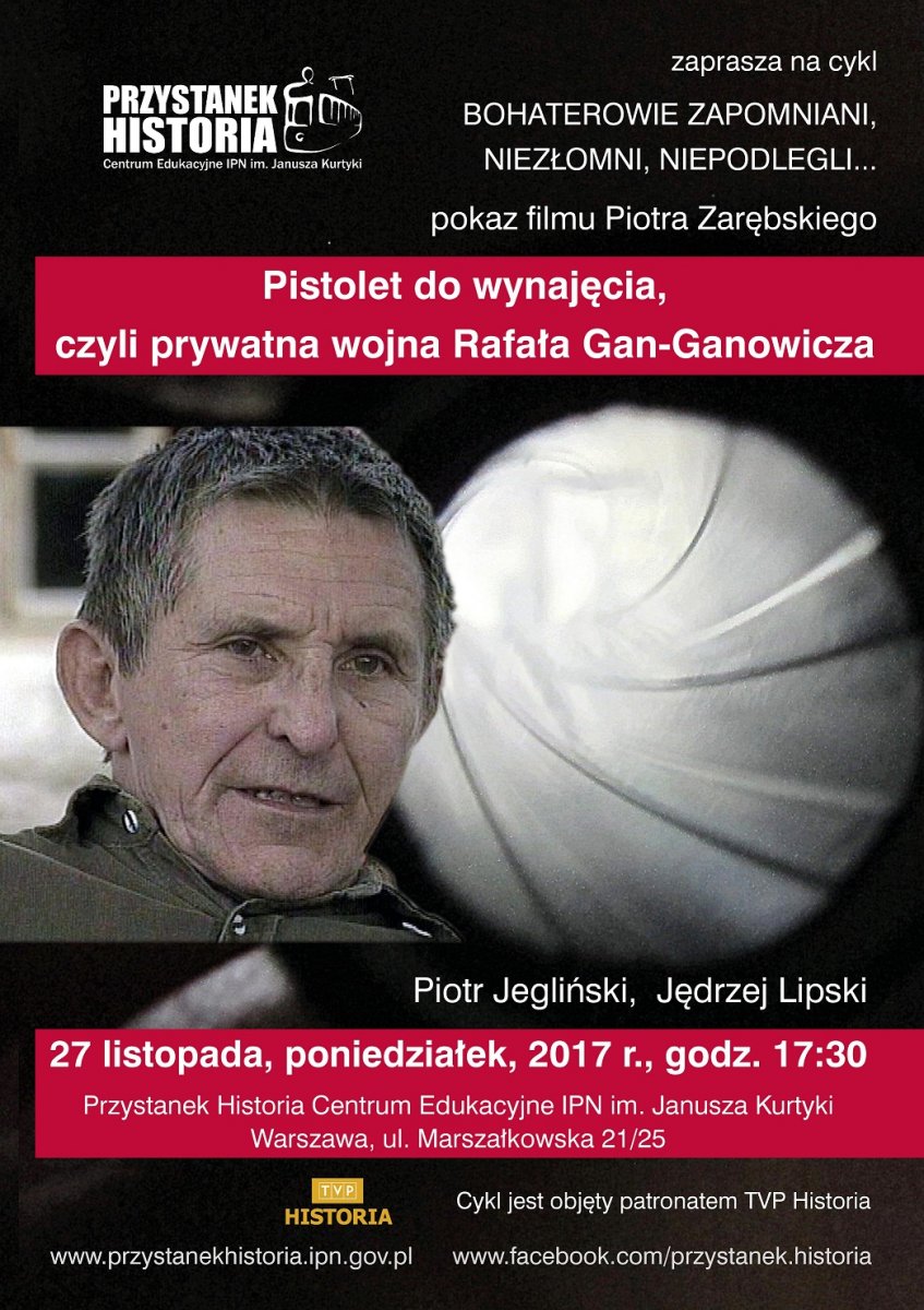 W ramach cyklu „Bohaterowie zapomniani, niezłomni, niepodlegli” w Centrum Edukacyjnym IPN Przystanek Historia 27 listopada wyświetlony został film Piotra Zarębskiego „Pistolet do wynajęcia, czyli prywatna wojna Rafała Gan-Ganowicza”. O bohaterze filmu dyskutowali Piotr Jegliński i prowadzący spotkanie – Jędrzej Lipski.