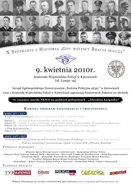 Zarząd Ogólnopolskiego Stowarzyszenia „Rodzina Policyjna 1939 r.” w Katowicach i Komenda Wojewódzka Policji w Katowicach zorganizowały obchody 70. rocznicy mordu NKWD na polskich policjantach „Zbrodnia Katyńska”, które odbyły się 9 kwietnia 2010 r. w auli im. aspiranta Policji woj. śląskiego Jana Kali w gmachu Komendy Wojewódzkiej Policji w Katowicach przy ul. Lompy 19.