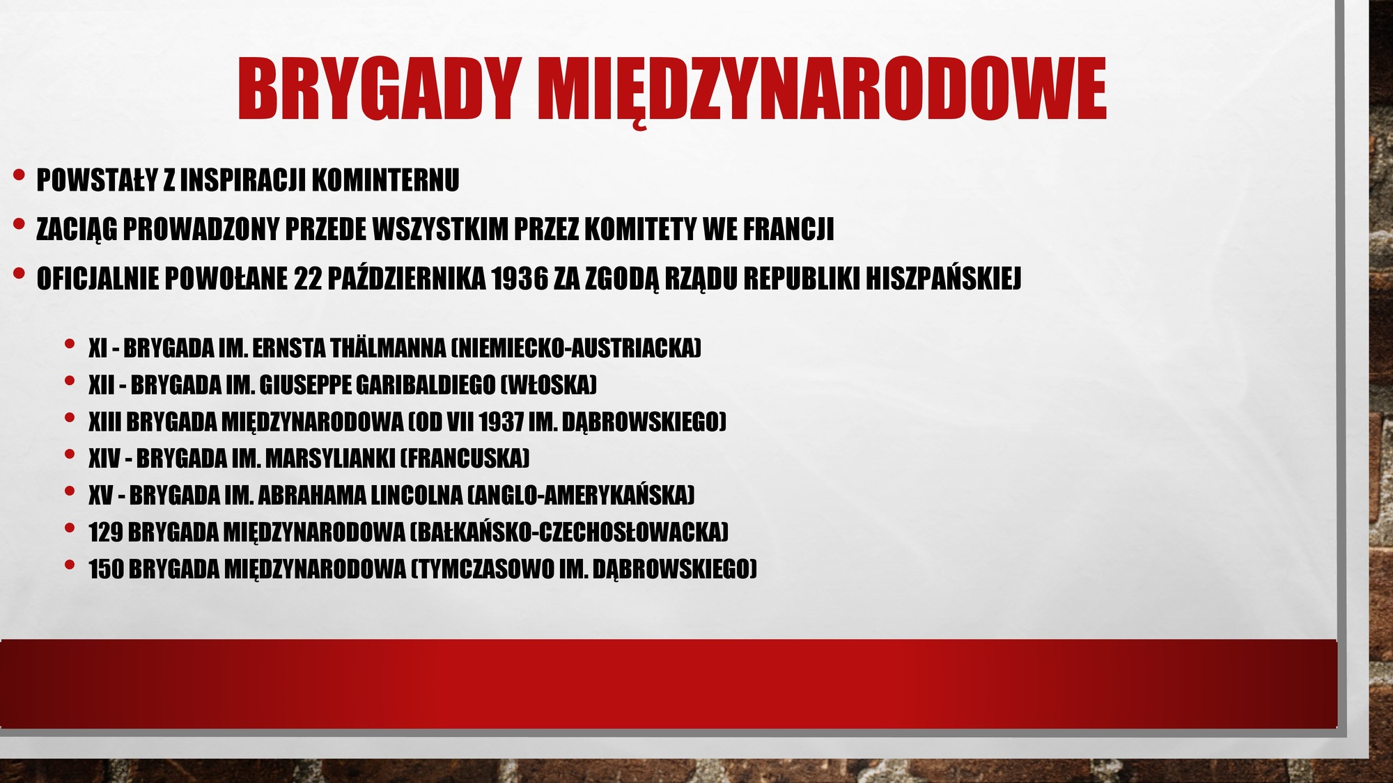 | Slajd prezentuje genezę i skład Brygad Międzynarodowych. Na wstępie podkreśla, że ich inicjatorem był Komintern (Międzynarodówka Komunistyczna z siedzibą w ZSRR). Polityczne umocowanie tej formacji i jej posunięcia zależały od władz w Moskwie. |