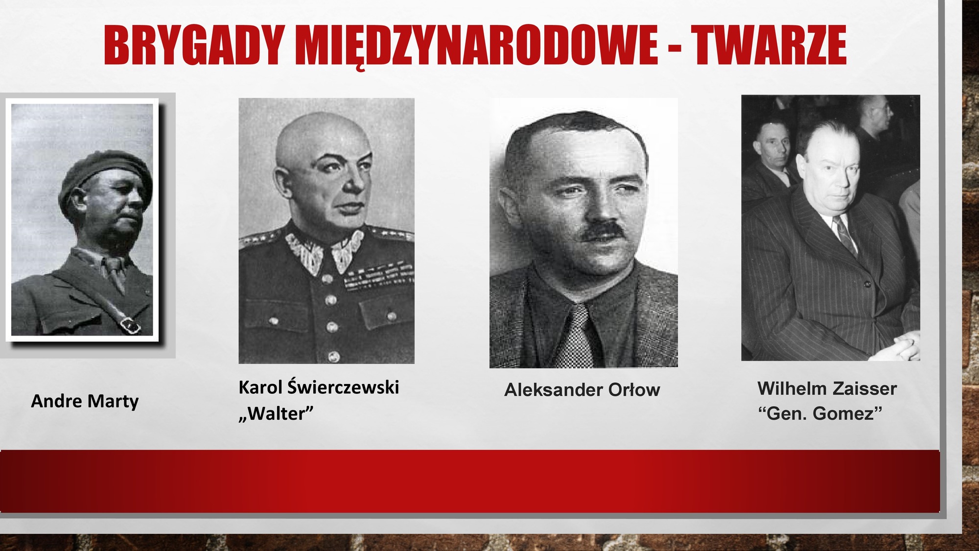 | Autorski wybór osób związanych z Brygadami Międzynarodowymi, ze szczególnym podkreśleniem ich komunistycznego rodowodu i brutalnego oblicza. Jednym z nich był Andre Marty (1886–1956), działacz komunistyczny, sekretarz Kominternu. W 1919 r. skazany na przymusowe roboty za wywołanie buntu we francuskiej flocie w Odessie, uczestniczącej w rosyjskiej wojnie domowej. Od 1923 r. działacz Komunistycznej Partii Francji. W czasie hiszpańskiej wojny domowej pełnił funkcję generalnego inspektora Brygad Międzynarodowych. W sposób bezwzględny eliminował wszystkich przeciwników stalinizmu. Przypisuje mu się wydanie pięciuset wyroków śmierci. |