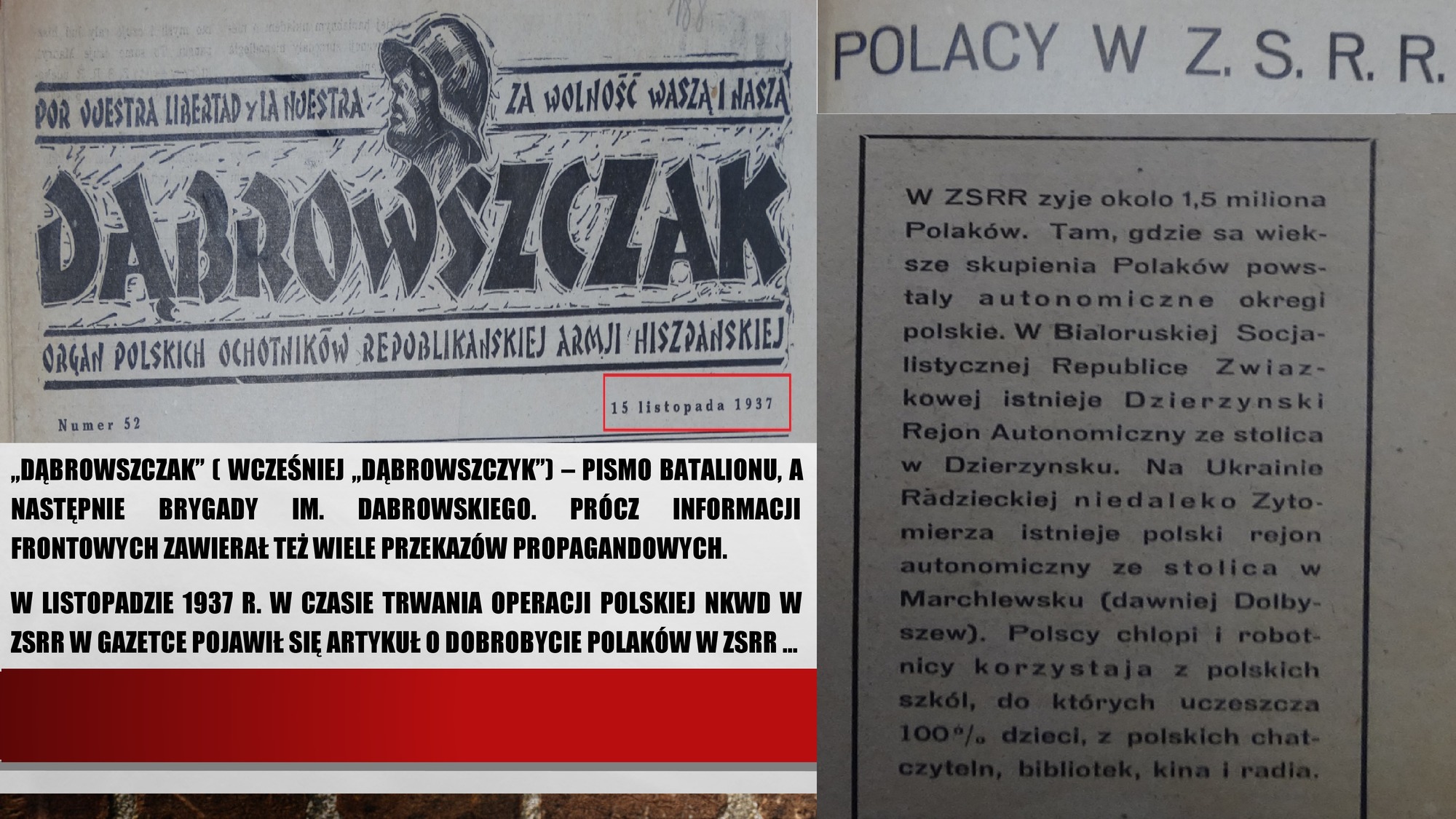 | W numerze 52 „Dąbrowszczaka” z 1937 roku wiele artykułów poświęcono rocznicy rewolucji październikowej w Rosji i osiągnięciom ZSRR. Jeden z tekstów dotyczył rzekomo dobrej sytuacji zamieszkałych tam obywateli polskich. Cynizm tego propagandowego przesłania podkreśla fakt, że w tym czasie trwała operacja polska NKWD 1937–1938, w czasie której Polacy byli mordowani i wywożeni do łagrów. |