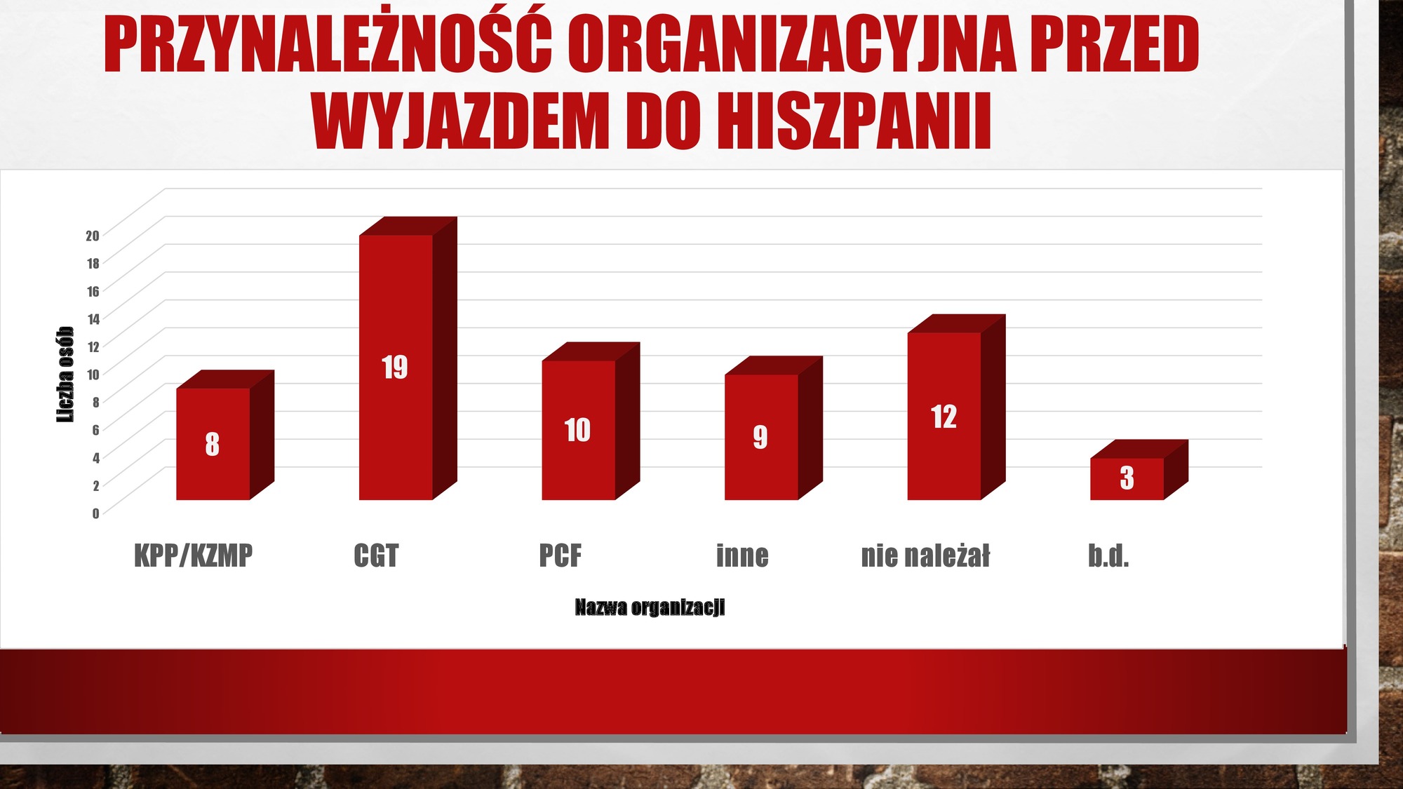 | Slajd prezentuje dane statyczne odnośnie członków powojennego „Związku Dąbrowszczaków” w okręgu gdańskim (jednego z większych w Polsce). Dane dotyczą 58 osób (okręg liczył około 62 członków). Wynika z nich, że w momencie zaciągu w szeregi Dąbrowszczaków więszkość ochotników związana była z lewicą (niekoniecznie komunistyczną). |
