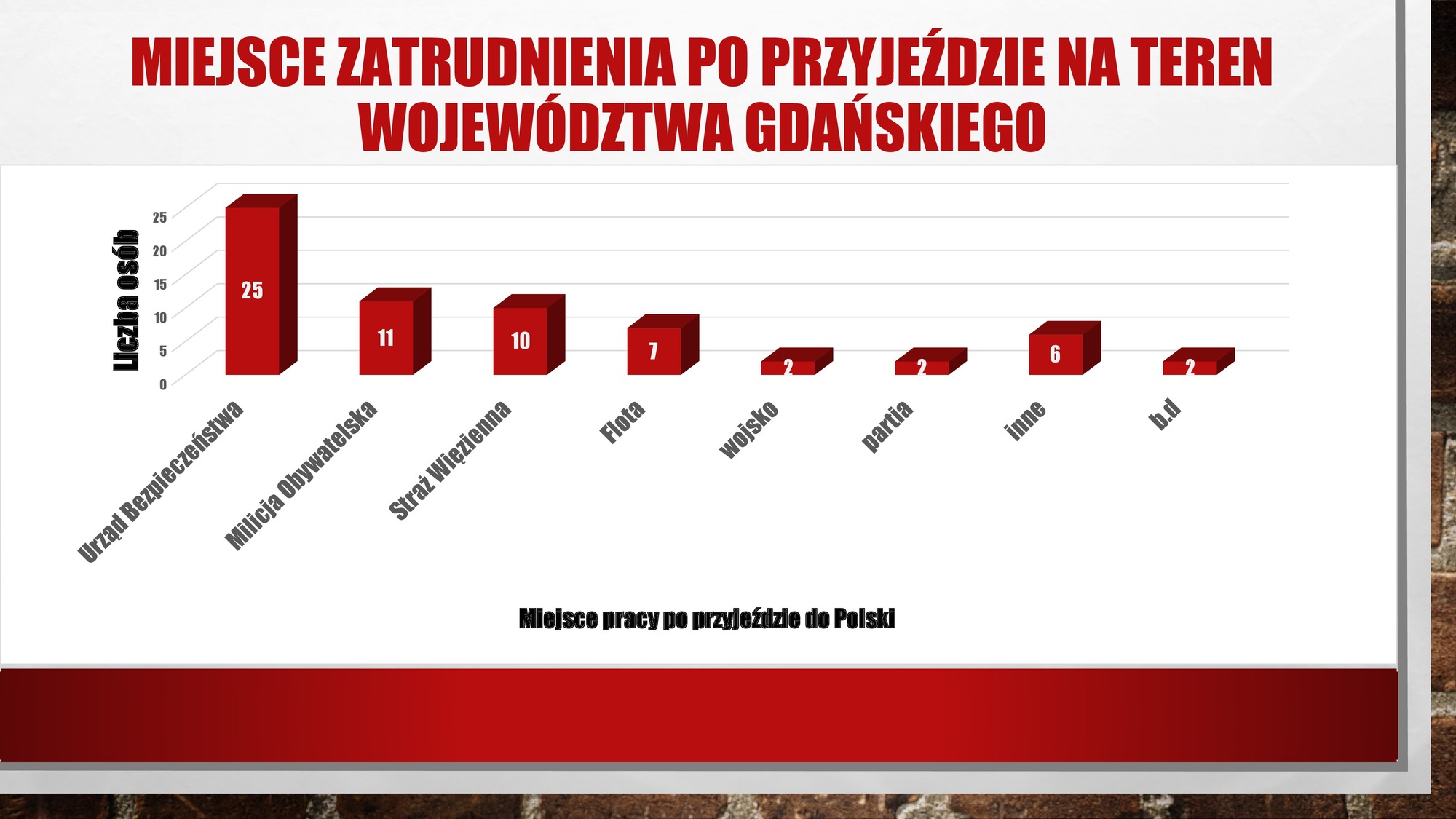 | Slajd prezentuje dane statystyczne dla grupy wymienionej w slajdzie 8. Wynika z niego, że większość gdańskich Dąbrowszczaków związała się z pracą w komunistycznym aparacie bezpieczeństwa (w latach czterdziestych Milicja i Straż Więzienna były częścią Ministerstwa Bezpieczeństwa Publicznego). |