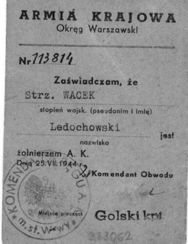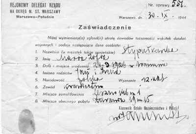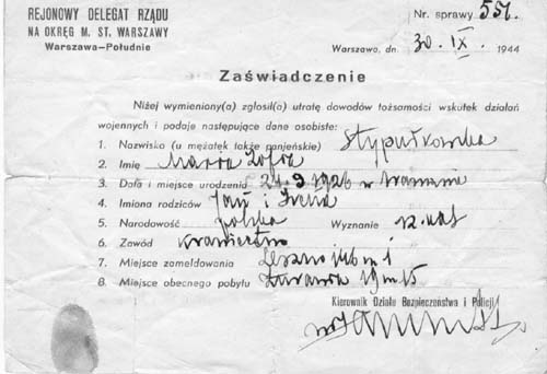 Zaświadczenie – potwierdzenie tożsamości Marii Stypułkowskiej „Kamy" (uczestniczki m.in. akcji na Kutscherę). -