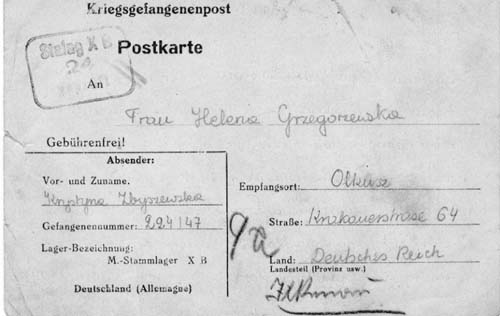 Kartka pocztowa wysłana z obozu jenieckiego Stammlager XB przez 14-letnią Krsytynę Zbyszewską – harcerkę z powstańczej poczty polowej. -