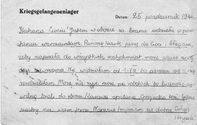 Kartka pocztowa wysłana z obozu jenieckiego Stammlager XB przez 14-letnią Krsytynę Zbyszewską – harcerkę z powstańczej poczty polowej.