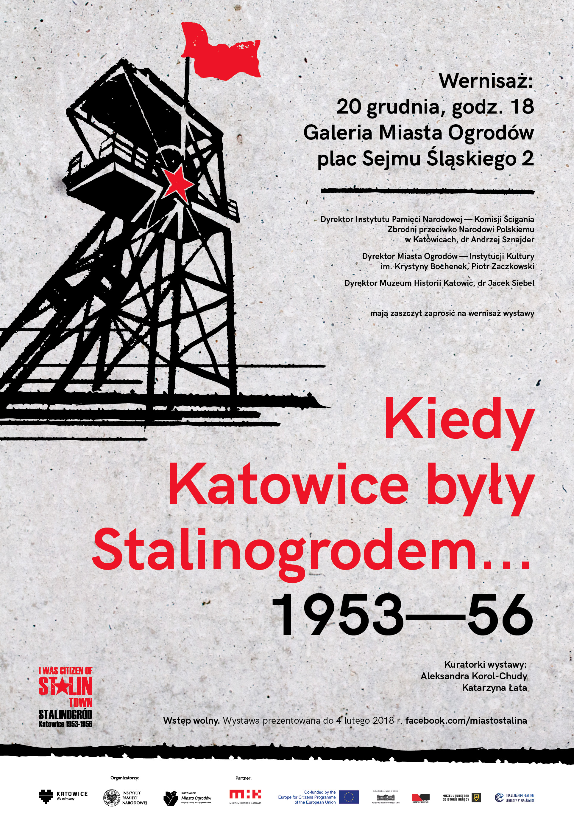 Wystawa „Kiedy Katowice były Stalinogrodem… 1953-1956“ powstała w efekcie realizowanego w 2017 r. międzynarodowego projektu „Byłem mieszkańcem miasta Stalina”. W przedsięwzięciu wzięło udział pięć miast z krajów Europy Środkowo-Wschodniej, które w czasach komunistycznych nosiły nazwę na cześć sowieckiego przywódcy Józefa Stalina. W Polsce ten wątpliwy zaszczyt przypadł w udziale Katowicom, przemianowanym na Stalinogród w okresie od marca 1953 r. do października 1956 r. W projekcie wzięły również udział miasto Braszów w Rumunii (Oraşul Stalin, 1951-1961), Kuçova w Albanii (Qyteti Stalin, 1950-1990), Warna w Bułgarii (Stalin, 1949-1956) i Dunaújváros na Węgrzech (Sztálinváros, 1951-1961). W każdej z tych miejscowości projekt realizowały naukowe ośrodki badawcze oraz instytucje kultury. Koordynatorami prac w Katowicach było Oddziałowe Biuro Edukacji Narodowej Instytutu Pamięci Narodowej oraz Katowice Miasto Ogrodów – Instytucja Kultury im. Krystyny Bochenek.