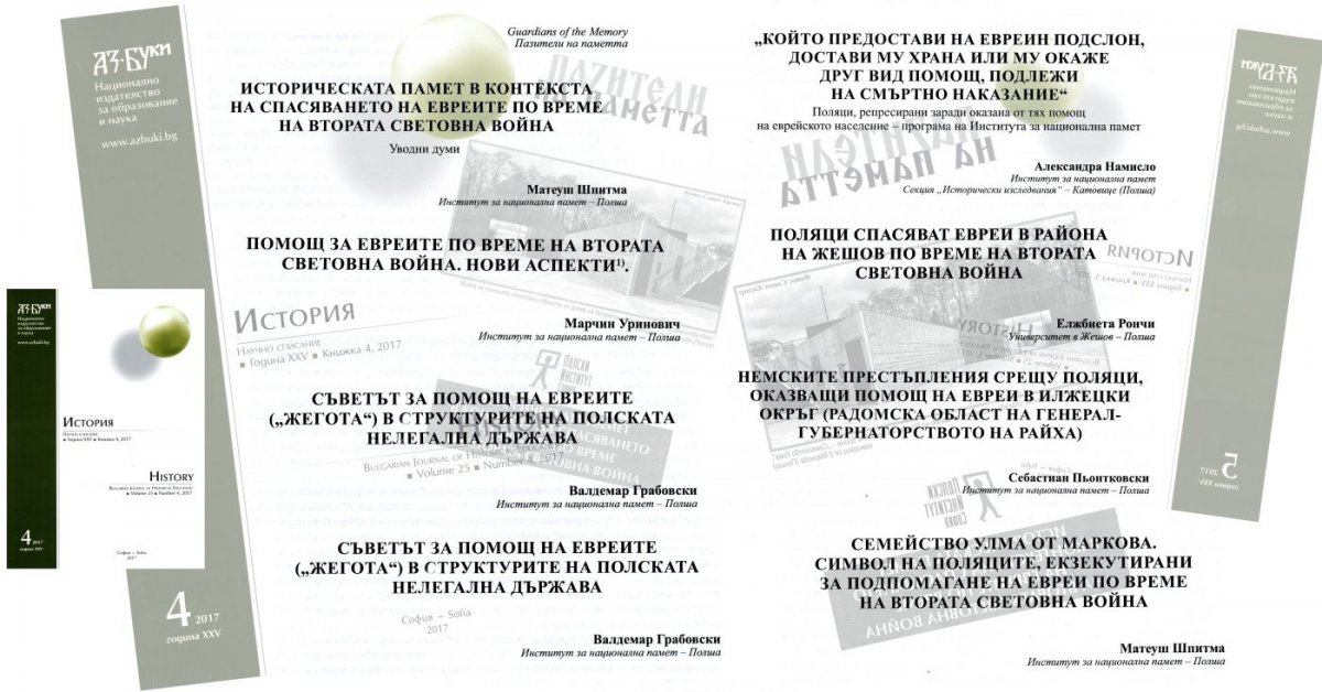 W dwóch tegorocznych numerach bułgarskiego czasopisma naukowego „Historia" (4/2017 i 5/2017) ukazał się zbiór artykułów koncentrujących się wokół zagadnienia „Pamięć historyczna w kontekście ratowania Żydów podczas II wojny światowej”. Wyniki swej pracy badawczej zaprezentowali związani z Instytutem Pamięci Narodwej historycy: Marcin Urynowicz, Waldemar Grabowski, Grzegorz Berendt, Aleksandra Namysło, Elżbieta Rączy, Sebastian Piątkowski, Mateusz Szpytma.