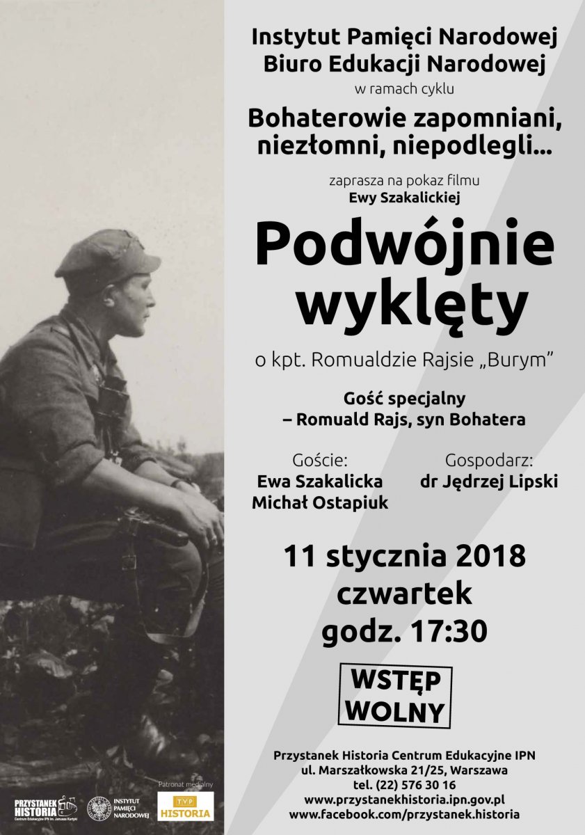 11 stycznia w ramach cyklu „Bohaterowie zapomniani, niezłomni, niepodlegli” na Przystanku Historia IPN w Warszawie wyświetlony został film Ewy Szakalickiej „Podwójnie wyklęty” o kpt. Romualdzie Rajsie „Burym”. Po projekcji odbyła się dyskusja, w której udział wzięli: dyrektor Biura Edukacji Narodowej Adam Hlebowicz, dr Kazimierz Krajewski z Oddziału IPN w Warszawie, Michał Ostapiuk z Delegatury IPN w Olsztynie, który pracuje nad pierwszą naukową biografią „Burego”, oraz Ewa Szakalicka, reżyserka. Rozmowę poprowadził dr Jędrzej Lipski.
